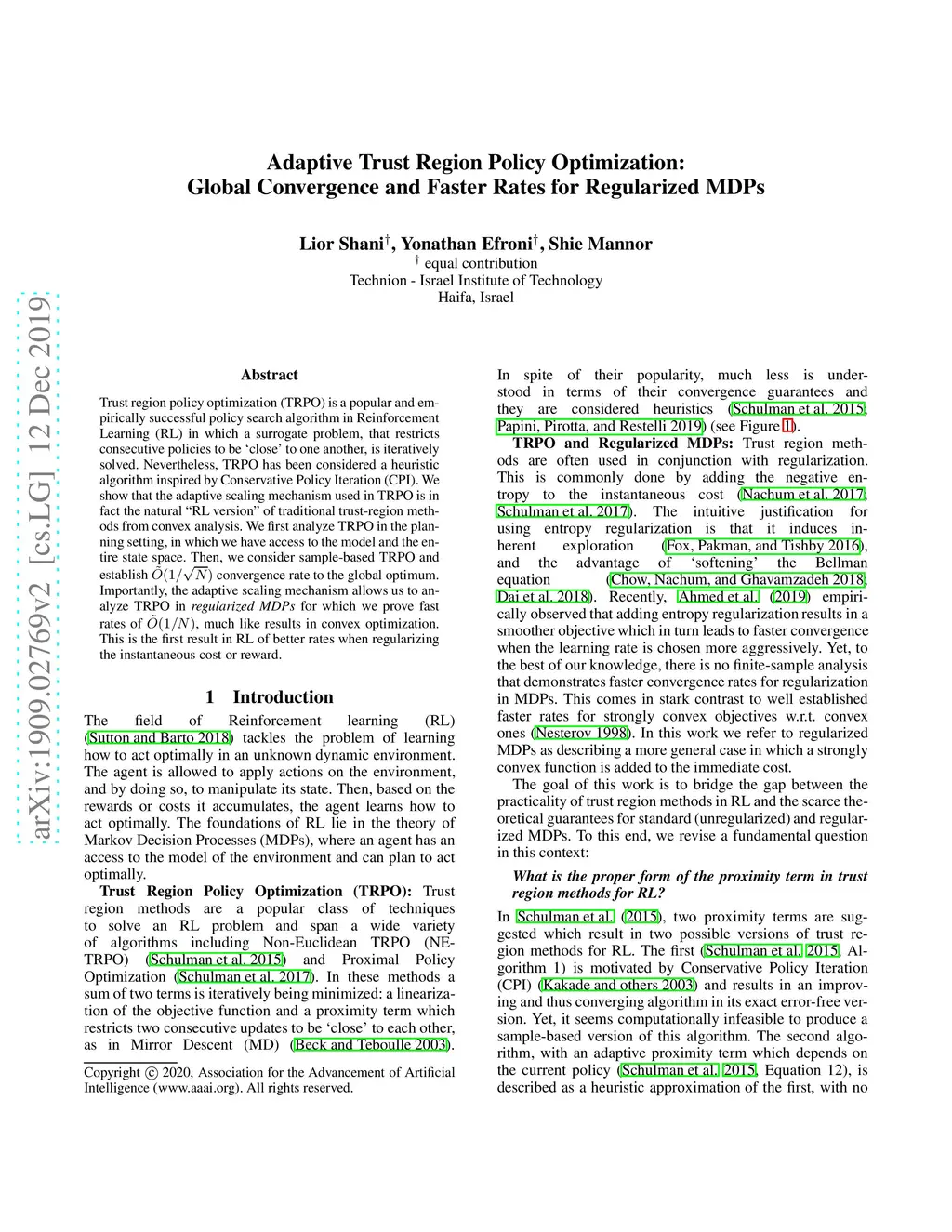 Trust region policy optimization (TRPO) is a popular and empirically successful policy search algorithm in Reinforcement Learning (RL) in which a surrogate problem, that restricts consecutive policies to be 'close' to one another, is iteratively solved. Nevertheless, TRPO has been considered a heuristic algorithm inspired by Conservative Policy Iteration (CPI). We show that the adaptive scaling mechanism used in TRPO is in fact the natural "RL version" of traditional trust-region methods from convex analysis. We first analyze TRPO in the planning setting, in which we have access to the model and the entire state space. Then, we consider sample-based TRPO and establish convergence rate to the global optimum. Importantly, the adaptive scaling mechanism allows us to analyze TRPO in regularized MDPs for which we prove fast rates of , much like results in convex optimization. This is the first result in RL of better rates when regularizing the instantaneous cost or reward.