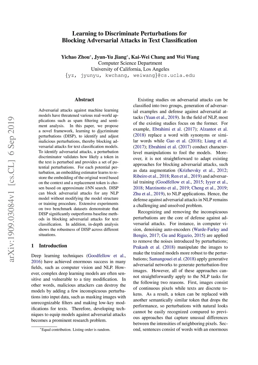 Adversarial attacks against machine learning models have threatened various real-world applications such as spam filtering and sentiment analysis. In this paper, we propose a novel framework, learning to DIScriminate Perturbations (DISP), to identify and adjust malicious perturbations, thereby blocking adversarial attacks for text classification models. To identify adversarial attacks, a perturbation discriminator validates how likely a token in the text is perturbed and provides a set of potential perturbations. For each potential perturbation, an embedding estimator learns to restore the embedding of the original word based on the context and a replacement token is chosen based on approximate kNN search. DISP can block adversarial attacks for any NLP model without modifying the model structure or training procedure. Extensive experiments on two benchmark datasets demonstrate that DISP significantly outperforms baseline methods in blocking adversarial attacks for text classification. In addition, in-depth analysis shows the robustness of DISP across different situations.