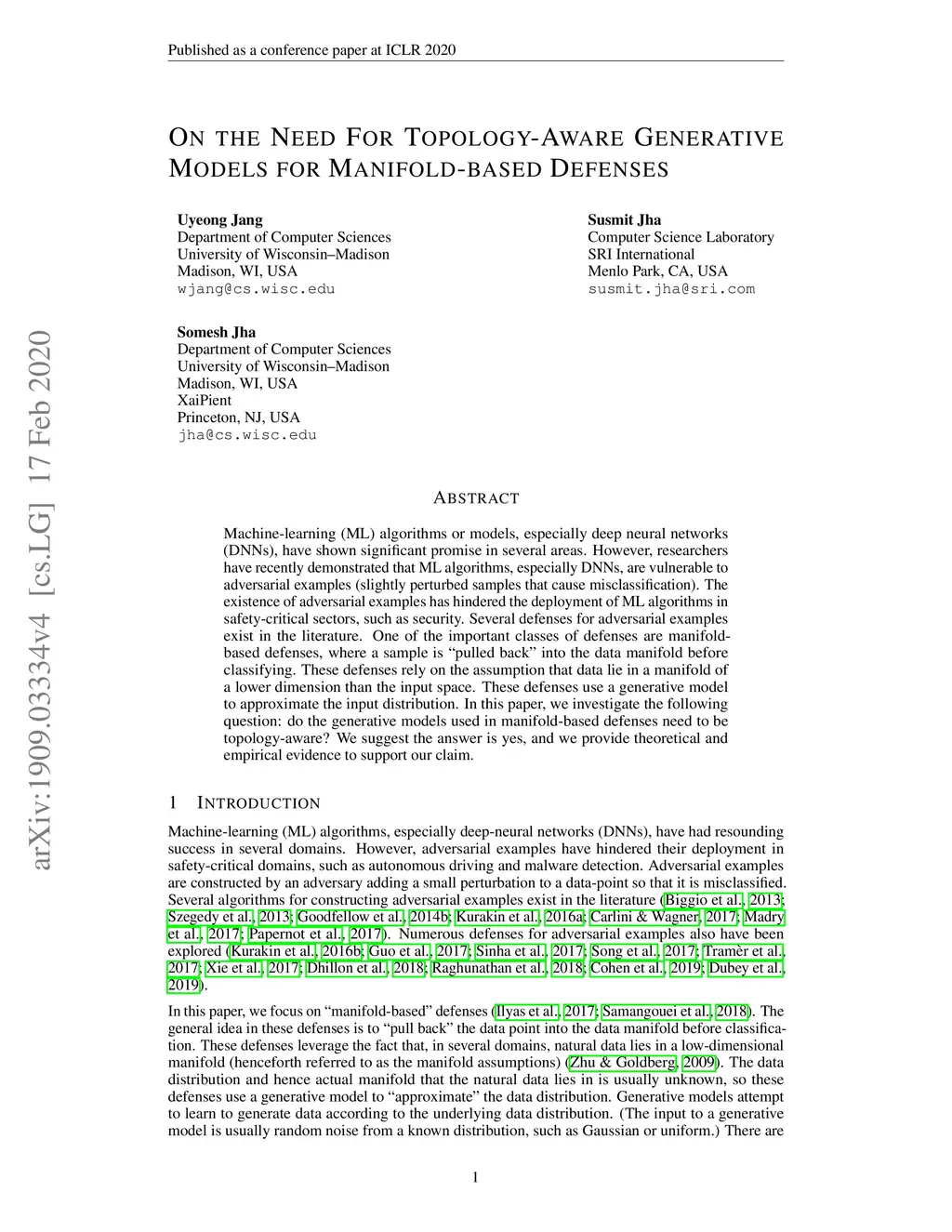 Machine-learning (ML) algorithms or models, especially deep neural networks (DNNs), have shown significant promise in several areas. However, researchers have recently demonstrated that ML algorithms, especially DNNs, are vulnerable to adversarial examples (slightly perturbed samples that cause misclassification). The existence of adversarial examples has hindered the deployment of ML algorithms in safety-critical sectors, such as security. Several defenses for adversarial examples exist in the literature. One of the important classes of defenses are manifold-based defenses, where a sample is ``pulled back" into the data manifold before classifying. These defenses rely on the assumption that data lie in a manifold of a lower dimension than the input space. These defenses use a generative model to approximate the input distribution. In this paper, we investigate the following question: do the generative models used in manifold-based defenses need to be topology-aware? We suggest the answer is yes, and we provide theoretical and empirical evidence to support our claim.