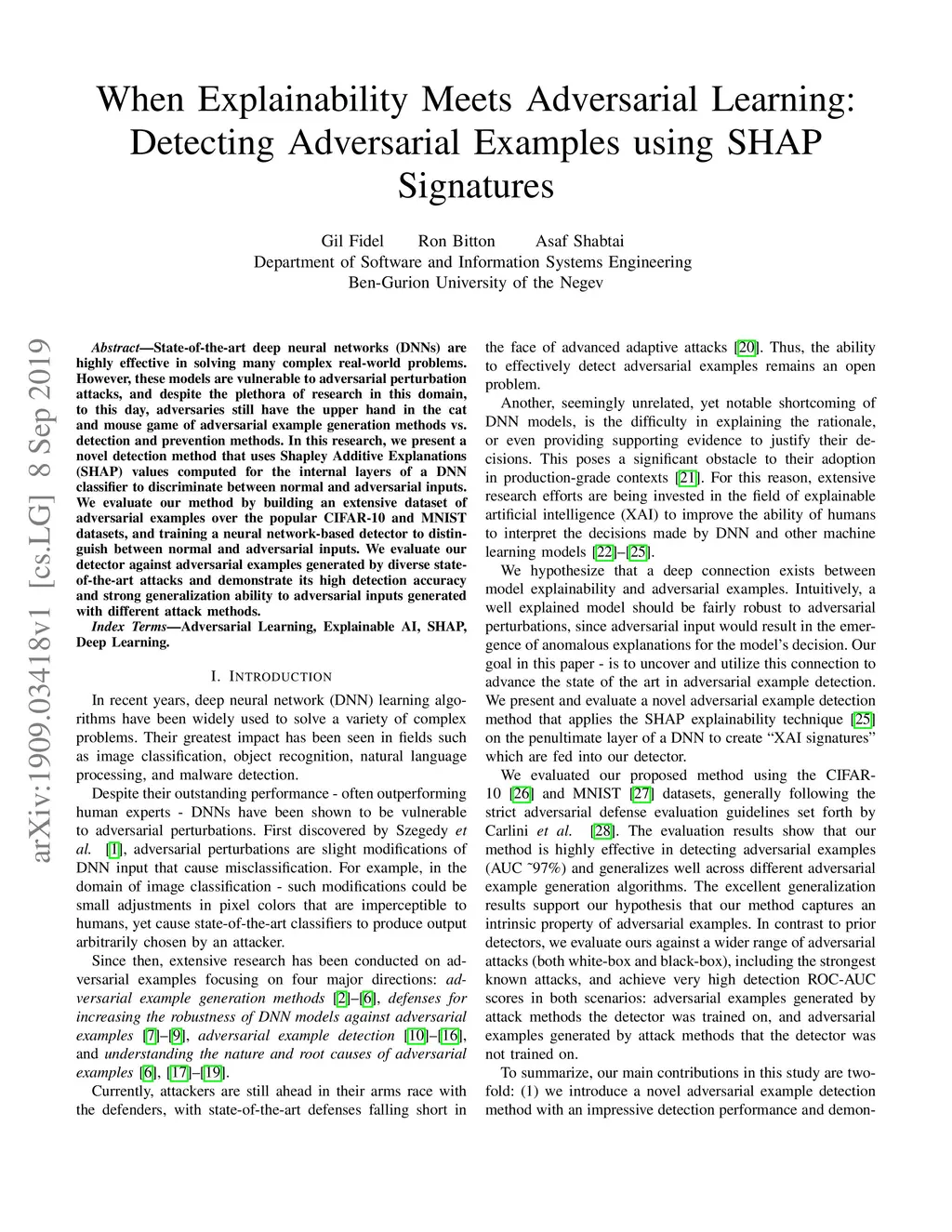 State-of-the-art deep neural networks (DNNs) are highly effective in solving many complex real-world problems. However, these models are vulnerable to adversarial perturbation attacks, and despite the plethora of research in this domain, to this day, adversaries still have the upper hand in the cat and mouse game of adversarial example generation methods vs. detection and prevention methods. In this research, we present a novel detection method that uses Shapley Additive Explanations (SHAP) values computed for the internal layers of a DNN classifier to discriminate between normal and adversarial inputs. We evaluate our method by building an extensive dataset of adversarial examples over the popular CIFAR-10 and MNIST datasets, and training a neural network-based detector to distinguish between normal and adversarial inputs. We evaluate our detector against adversarial examples generated by diverse state-of-the-art attacks and demonstrate its high detection accuracy and strong generalization ability to adversarial inputs generated with different attack methods.