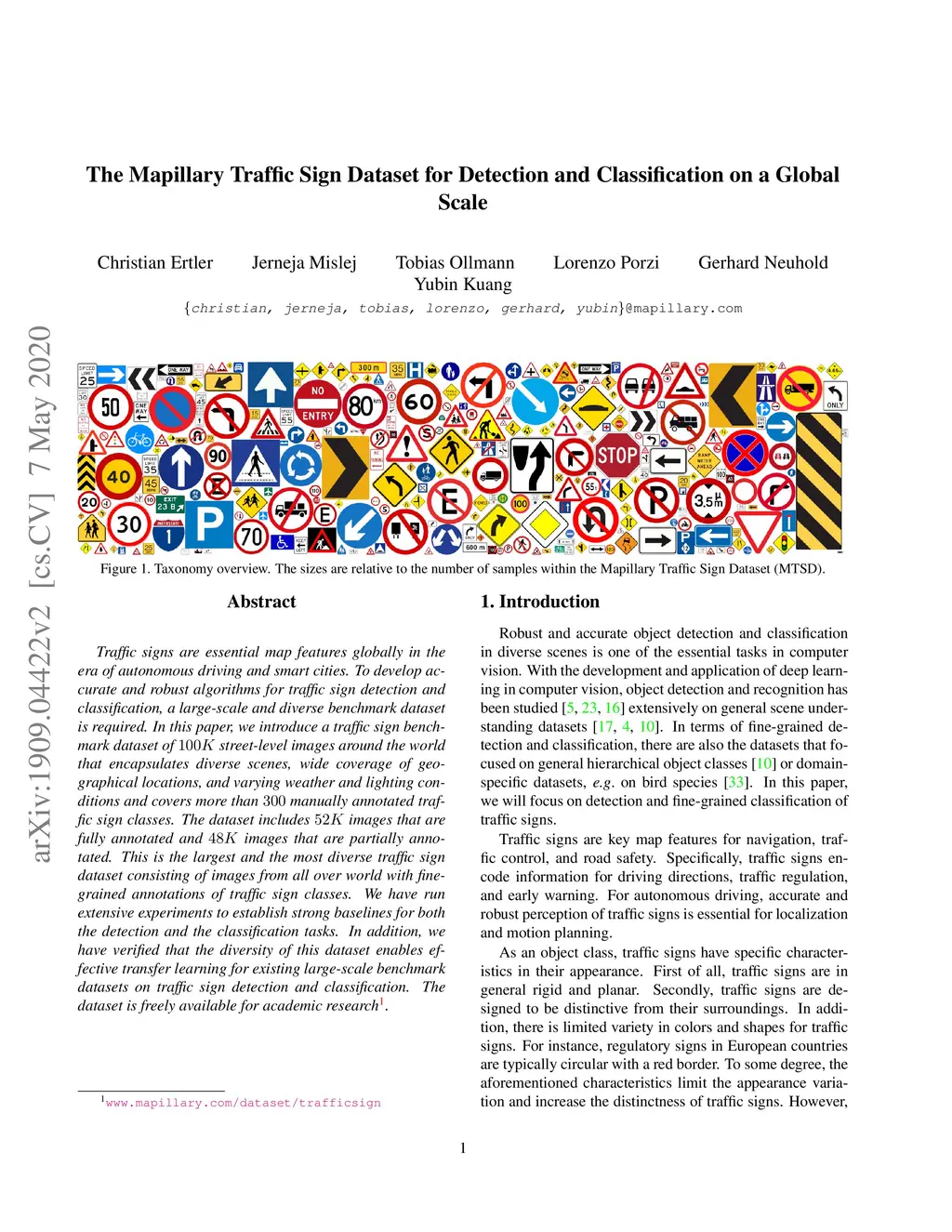 The Mapillary Traffic Sign Dataset for Detection and Classification on a