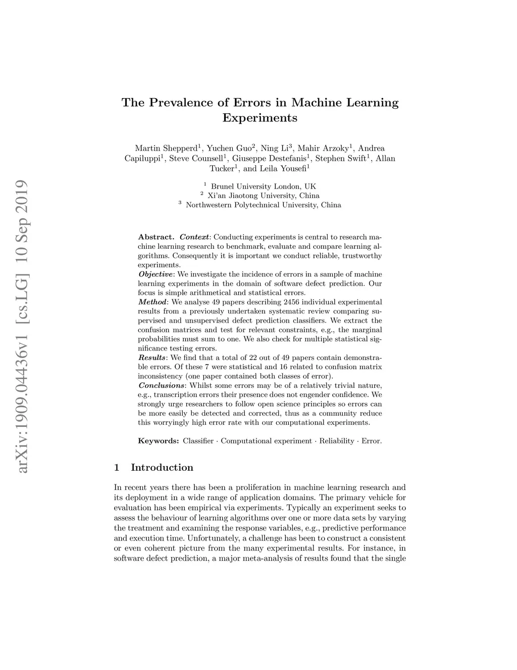 Context: Conducting experiments is central to research machine learning research to benchmark, evaluate and compare learning algorithms. Consequently it is important we conduct reliable, trustworthy experiments. Objective: We investigate the incidence of errors in a sample of machine learning experiments in the domain of software defect prediction. Our focus is simple arithmetical and statistical errors. Method: We analyse 49 papers describing 2456 individual experimental results from a previously undertaken systematic review comparing supervised and unsupervised defect prediction classifiers. We extract the confusion matrices and test for relevant constraints, e.g., the marginal probabilities must sum to one. We also check for multiple statistical significance testing errors. Results: We find that a total of 22 out of 49 papers contain demonstrable errors. Of these 7 were statistical and 16 related to confusion matrix inconsistency (one paper contained both classes of error). Conclusions: Whilst some errors may be of a relatively trivial nature, e.g., transcription errors their presence does not engender confidence. We strongly urge researchers to follow open science principles so errors can be more easily be detected and corrected, thus as a community reduce this worryingly high error rate with our computational experiments.