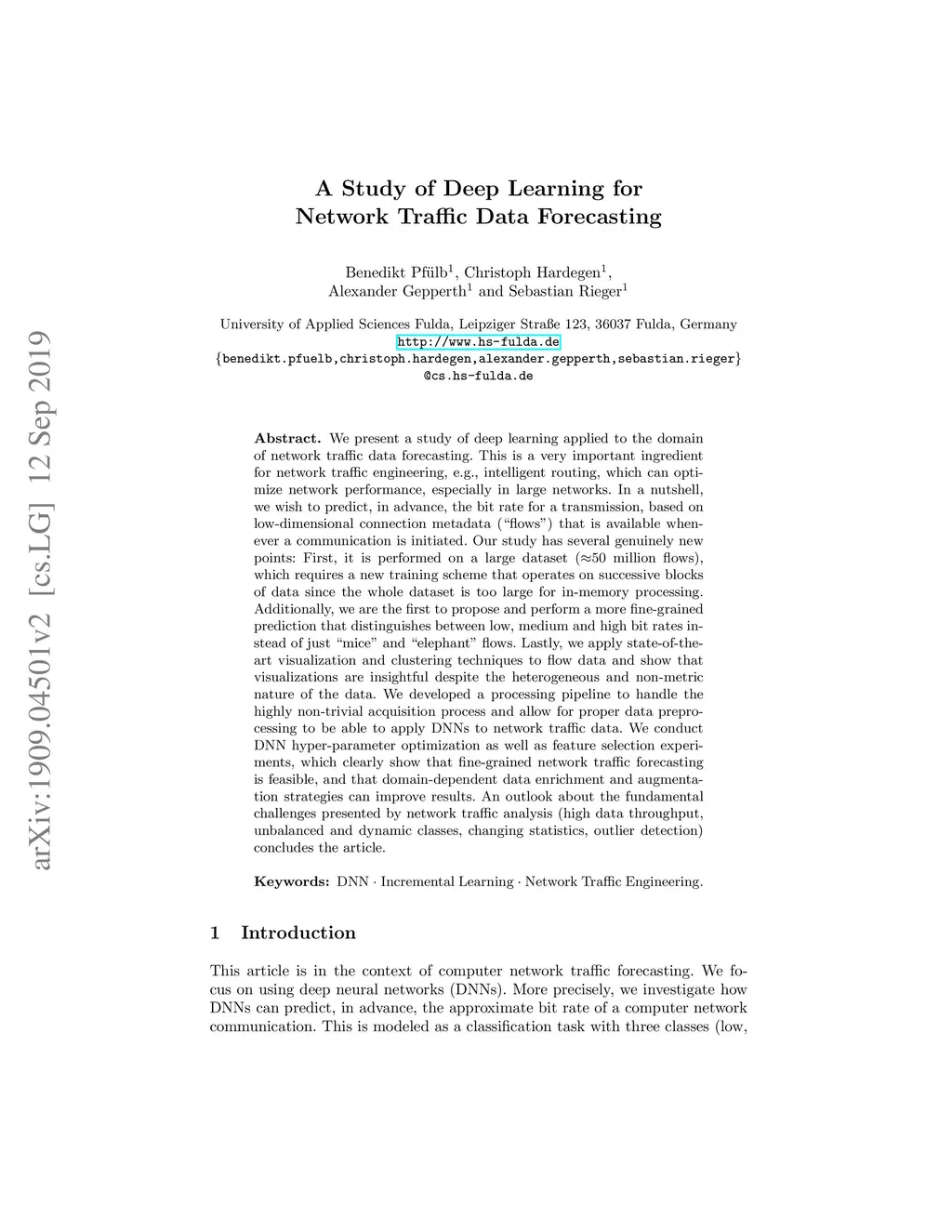 We present a study of deep learning applied to the domain of network traffic data forecasting. This is a very important ingredient for network traffic engineering, e.g., intelligent routing, which can optimize network performance, especially in large networks. In a nutshell, we wish to predict, in advance, the bit rate for a transmission, based on low-dimensional connection metadata ("flows") that is available whenever a communication is initiated. Our study has several genuinely new points: First, it is performed on a large dataset (~50 million flows), which requires a new training scheme that operates on successive blocks of data since the whole dataset is too large for in-memory processing. Additionally, we are the first to propose and perform a more fine-grained prediction that distinguishes between low, medium and high bit rates instead of just "mice" and "elephant" flows. Lastly, we apply state-of-the-art visualization and clustering techniques to flow data and show that visualizations are insightful despite the heterogeneous and non-metric nature of the data. We developed a processing pipeline to handle the highly non-trivial acquisition process and allow for proper data preprocessing to be able to apply DNNs to network traffic data. We conduct DNN hyper-parameter optimization as well as feature selection experiments, which clearly show that fine-grained network traffic forecasting is feasible, and that domain-dependent data enrichment and augmentation strategies can improve results. An outlook about the fundamental challenges presented by network traffic analysis (high data throughput, unbalanced and dynamic classes, changing statistics, outlier detection) concludes the article.