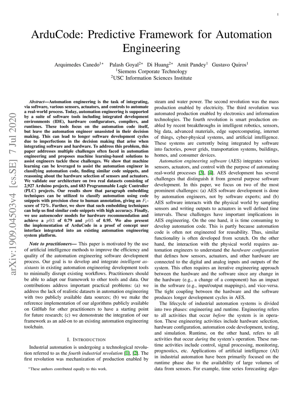 Automation engineering is the task of integrating, via software, various sensors, actuators, and controls for automating a real-world process. Today, automation engineering is supported by a suite of software tools including integrated development environments (IDE), hardware configurators, compilers, and runtimes. These tools focus on the automation code itself, but leave the automation engineer unassisted in their decision making. This can lead to increased time for software development because of imperfections in decision making leading to multiple iterations between software and hardware. To address this, this paper defines multiple challenges often faced in automation engineering and propose solutions using machine learning to assist engineers tackle such challenges. We show that machine learning can be leveraged to assist the automation engineer in classifying automation, finding similar code snippets, and reasoning about the hardware selection of sensors and actuators. We validate our architecture on two real datasets consisting of 2,927 Arduino projects, and 683 Programmable Logic Controller (PLC) projects. Our results show that paragraph embedding techniques can be utilized to classify automation using code snippets with precision close to human annotation, giving an F1-score of 72%. Further, we show that such embedding techniques can help us find similar code snippets with high accuracy. Finally, we use autoencoder models for hardware recommendation and achieve a p@3 of 0.79 and p@5 of 0.95.