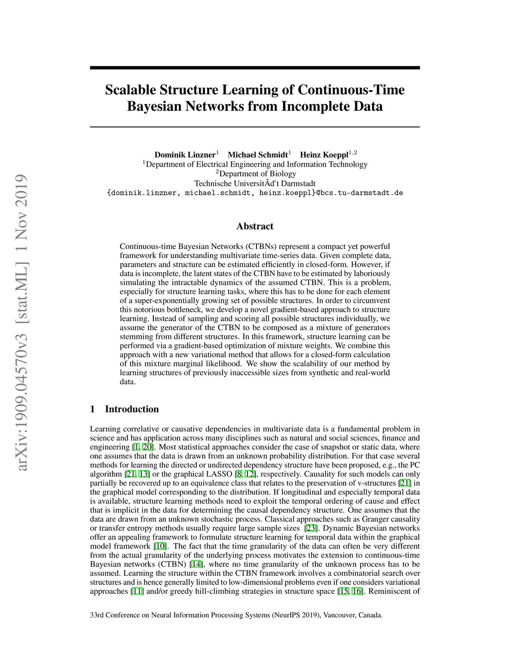 Continuous-time Bayesian Networks (CTBNs) represent a compact yet powerful framework for understanding multivariate time-series data. Given complete data, parameters and structure can be estimated efficiently in closed-form. However, if data is incomplete, the latent states of the CTBN have to be estimated by laboriously simulating the intractable dynamics of the assumed CTBN. This is a problem, especially for structure learning tasks, where this has to be done for each element of a super-exponentially growing set of possible structures. In order to circumvent this notorious bottleneck, we develop a novel gradient-based approach to structure learning. Instead of sampling and scoring all possible structures individually, we assume the generator of the CTBN to be composed as a mixture of generators stemming from different structures. In this framework, structure learning can be performed via a gradient-based optimization of mixture weights. We combine this approach with a new variational method that allows for a closed-form calculation of this mixture marginal likelihood. We show the scalability of our method by learning structures of previously inaccessible sizes from synthetic and real-world data.