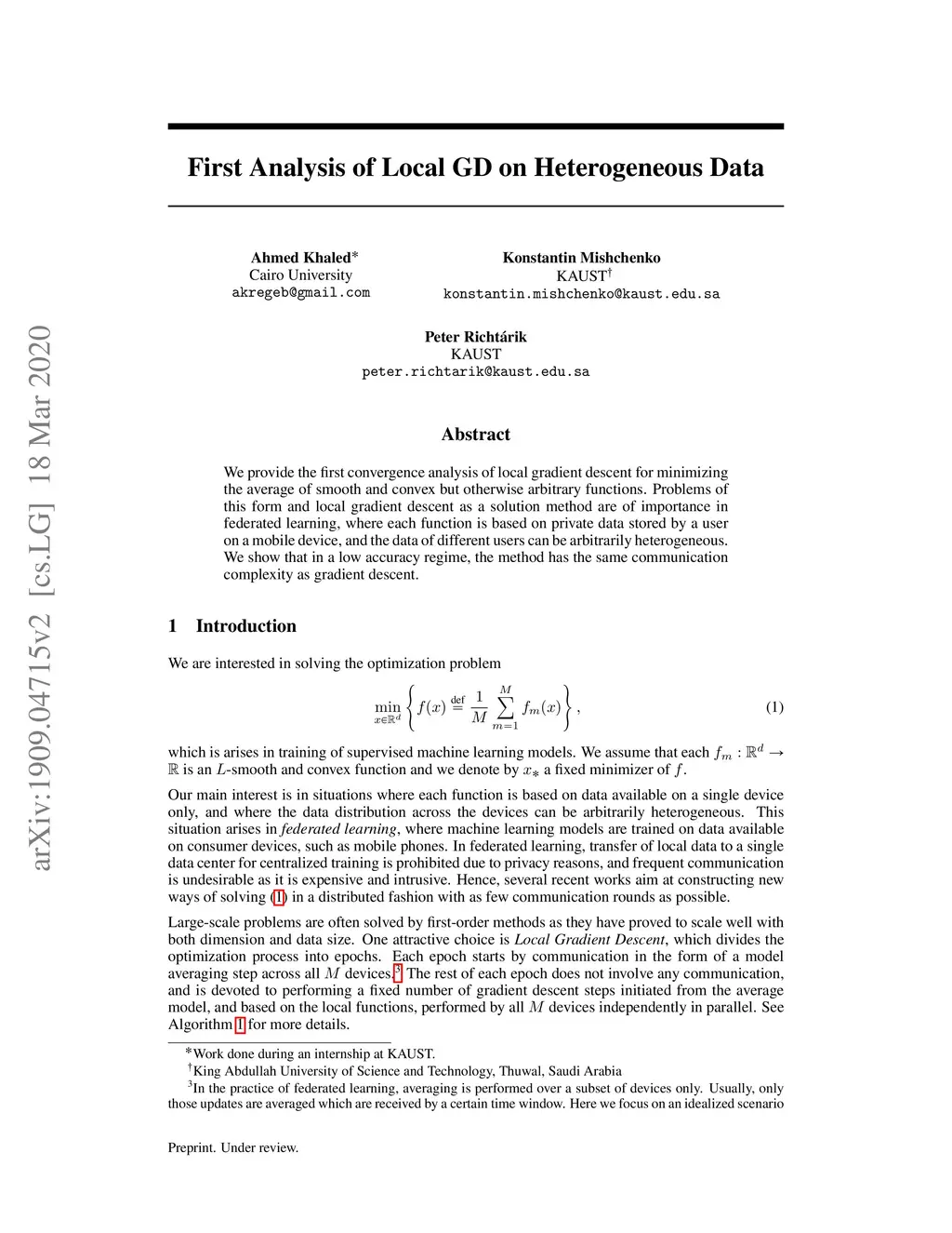 We provide the first convergence analysis of local gradient descent for minimizing the average of smooth and convex but otherwise arbitrary functions. Problems of this form and local gradient descent as a solution method are of importance in federated learning, where each function is based on private data stored by a user on a mobile device, and the data of different users can be arbitrarily heterogeneous. We show that in a low accuracy regime, the method has the same communication complexity as gradient descent.
