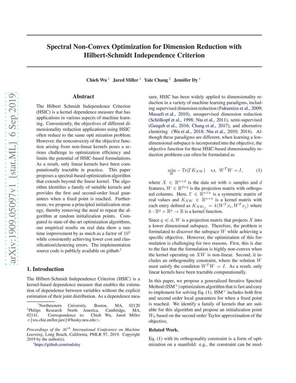 The Hilbert Schmidt Independence Criterion (HSIC) is a kernel dependence measure that has applications in various aspects of machine learning. Conveniently, the objectives of different dimensionality reduction applications using HSIC often reduce to the same optimization problem. However, the nonconvexity of the objective function arising from non-linear kernels poses a serious challenge to optimization efficiency and limits the potential of HSIC-based formulations. As a result, only linear kernels have been computationally tractable in practice. This paper proposes a spectral-based optimization algorithm that extends beyond the linear kernel. The algorithm identifies a family of suitable kernels and provides the first and second-order local guarantees when a fixed point is reached. Furthermore, we propose a principled initialization strategy, thereby removing the need to repeat the algorithm at random initialization points. Compared to state-of-the-art optimization algorithms, our empirical results on real data show a run-time improvement by as much as a factor of while consistently achieving lower cost and classification/clustering errors. The implementation source code is publicly available on https://github.com/endsley.