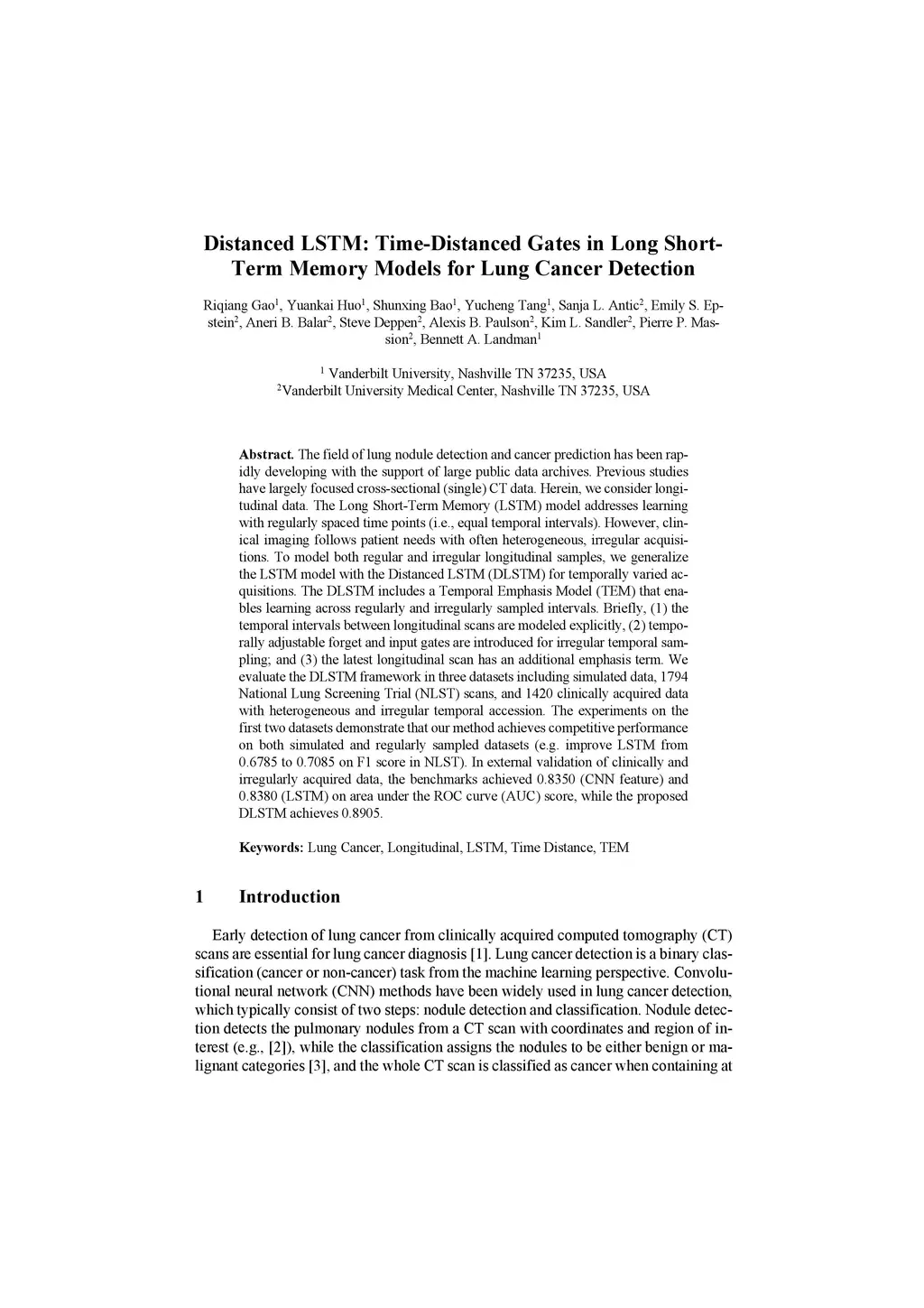 The field of lung nodule detection and cancer prediction has been rapidly developing with the support of large public data archives. Previous studies have largely focused on cross-sectional (single) CT data. Herein, we consider longitudinal data. The Long Short-Term Memory (LSTM) model addresses learning with regularly spaced time points (i.e., equal temporal intervals). However, clinical imaging follows patient needs with often heterogeneous, irregular acquisitions. To model both regular and irregular longitudinal samples, we generalize the LSTM model with the Distanced LSTM (DLSTM) for temporally varied acquisitions. The DLSTM includes a Temporal Emphasis Model (TEM) that enables learning across regularly and irregularly sampled intervals. Briefly, (1) the time intervals between longitudinal scans are modeled explicitly, (2) temporally adjustable forget and input gates are introduced for irregular temporal sampling; and (3) the latest longitudinal scan has an additional emphasis term. We evaluate the DLSTM framework in three datasets including simulated data, 1794 National Lung Screening Trial (NLST) scans, and 1420 clinically acquired data with heterogeneous and irregular temporal accession. The experiments on the first two datasets demonstrate that our method achieves competitive performance on both simulated and regularly sampled datasets (e.g. improve LSTM from 0.6785 to 0.7085 on F1 score in NLST). In external validation of clinically and irregularly acquired data, the benchmarks achieved 0.8350 (CNN feature) and 0.8380 (LSTM) on the area under the ROC curve (AUC) score, while the proposed DLSTM achieves 0.8905.
