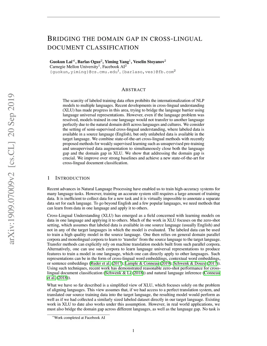 The scarcity of labeled training data often prohibits the internationalization of NLP models to multiple languages. Recent developments in cross-lingual understanding (XLU) has made progress in this area, trying to bridge the language barrier using language universal representations. However, even if the language problem was resolved, models trained in one language would not transfer to another language perfectly due to the natural domain drift across languages and cultures. We consider the setting of semi-supervised cross-lingual understanding, where labeled data is available in a source language (English), but only unlabeled data is available in the target language. We combine state-of-the-art cross-lingual methods with recently proposed methods for weakly supervised learning such as unsupervised pre-training and unsupervised data augmentation to simultaneously close both the language gap and the domain gap in XLU. We show that addressing the domain gap is crucial. We improve over strong baselines and achieve a new state-of-the-art for cross-lingual document classification.