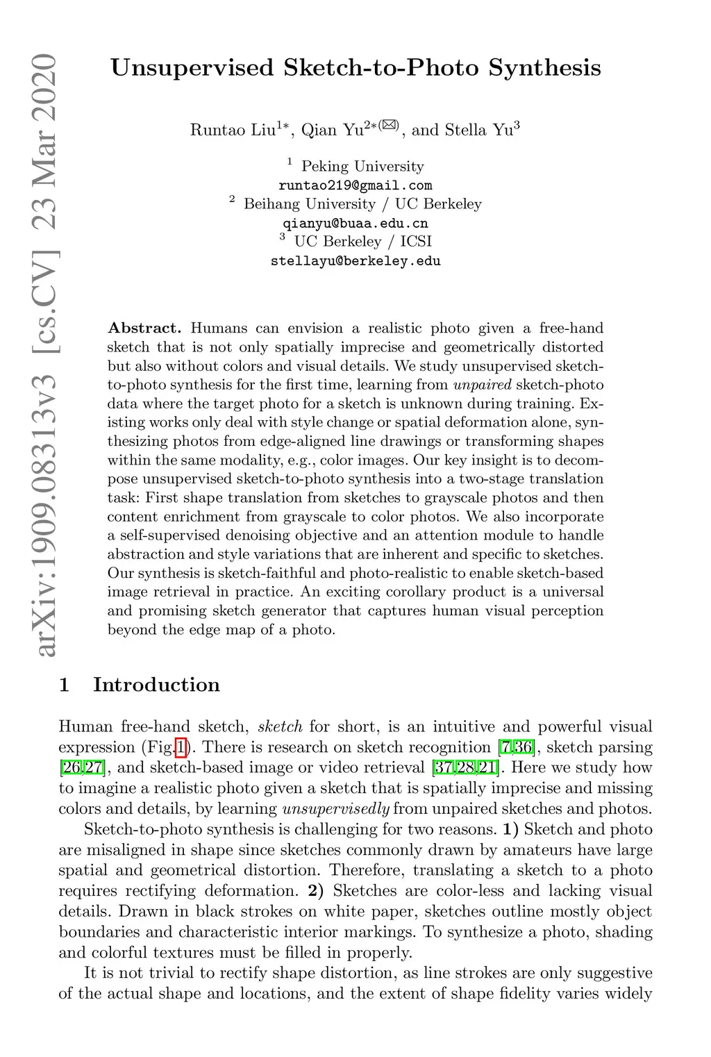 Humans can envision a realistic photo given a free-hand sketch that is not only spatially imprecise and geometrically distorted but also without colors and visual details. We study unsupervised sketch-to-photo synthesis for the first time, learning from unpaired sketch-photo data where the target photo for a sketch is unknown during training. Existing works only deal with style change or spatial deformation alone, synthesizing photos from edge-aligned line drawings or transforming shapes within the same modality, e.g., color images. Our key insight is to decompose unsupervised sketch-to-photo synthesis into a two-stage translation task: First shape translation from sketches to grayscale photos and then content enrichment from grayscale to color photos. We also incorporate a self-supervised denoising objective and an attention module to handle abstraction and style variations that are inherent and specific to sketches. Our synthesis is sketch-faithful and photo-realistic to enable sketch-based image retrieval in practice. An exciting corollary product is a universal and promising sketch generator that captures human visual perception beyond the edge map of a photo.