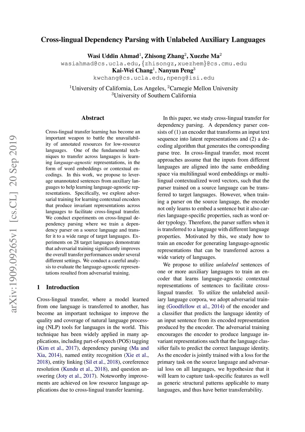 Cross-lingual transfer learning has become an important weapon to battle the unavailability of annotated resources for low-resource languages. One of the fundamental techniques to transfer across languages is learning \emph{language-agnostic} representations, in the form of word embeddings or contextual encodings. In this work, we propose to leverage unannotated sentences from auxiliary languages to help learning language-agnostic representations. Specifically, we explore adversarial training for learning contextual encoders that produce invariant representations across languages to facilitate cross-lingual transfer. We conduct experiments on cross-lingual dependency parsing where we train a dependency parser on a source language and transfer it to a wide range of target languages. Experiments on 28 target languages demonstrate that adversarial training significantly improves the overall transfer performances under several different settings. We conduct a careful analysis to evaluate the language-agnostic representations resulted from adversarial training.