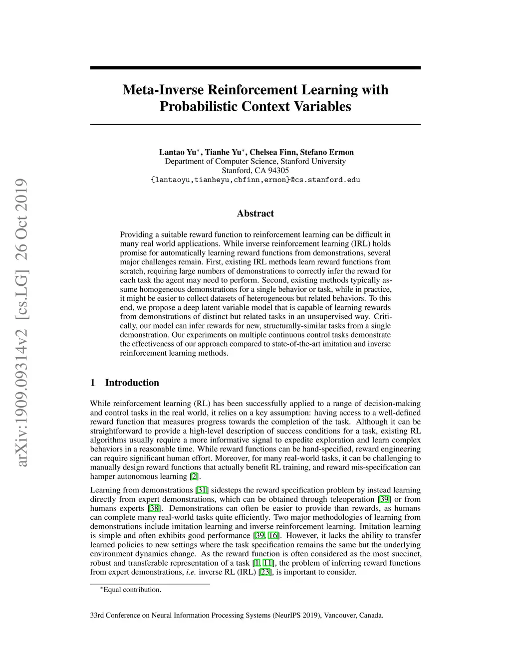 Meta-Inverse Reinforcement Learning with Probabilistic Context Variables