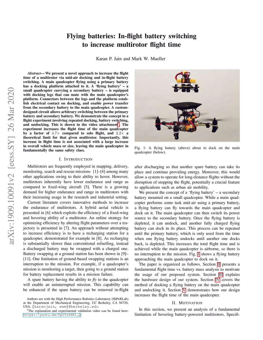 We present a novel approach to increase the flight time of a multirotor via mid-air docking and in-flight battery switching. A main quadcopter flying using a primary battery has a docking platform attached to it. A 'flying battery' - a small quadcopter carrying a secondary battery - is equipped with docking legs that can mate with the main quadcopter's platform. Connectors between the legs and the platform establish electrical contact on docking, and enable power transfer from the secondary battery to the main quadcopter. A custom-designed circuit allows arbitrary switching between the primary battery and secondary battery. We demonstrate the concept in a flight experiment involving repeated docking, battery switching, and undocking. The experiment increases the flight time of the main quadcopter by a factor of 4.7x compared to solo flight, and 2.2x a theoretical limit for that given multirotor. Importantly, this increase in flight time is not associated with a large increase in overall vehicle mass or size, leaving the main quadcopter in fundamentally the same safety class.