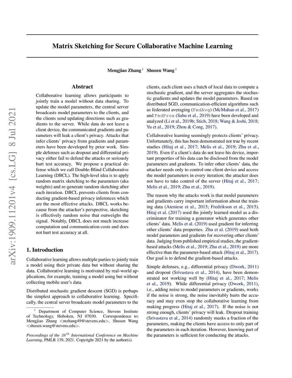Collaborative learning allows participants to jointly train a model without data sharing. To update the model parameters, the central server broadcasts model parameters to the clients, and the clients send updating directions such as gradients to the server. While data do not leave a client device, the communicated gradients and parameters will leak a client's privacy. Attacks that infer clients' privacy from gradients and parameters have been developed by prior work. Simple defenses such as dropout and differential privacy either fail to defend the attacks or seriously hurt test accuracy. We propose a practical defense which we call Double-Blind Collaborative Learning (DBCL). The high-level idea is to apply random matrix sketching to the parameters (aka weights) and re-generate random sketching after each iteration. DBCL prevents clients from conducting gradient-based privacy inferences which are the most effective attacks. DBCL works because from the attacker's perspective, sketching is effectively random noise that outweighs the signal. Notably, DBCL does not much increase computation and communication costs and does not hurt test accuracy at all.
