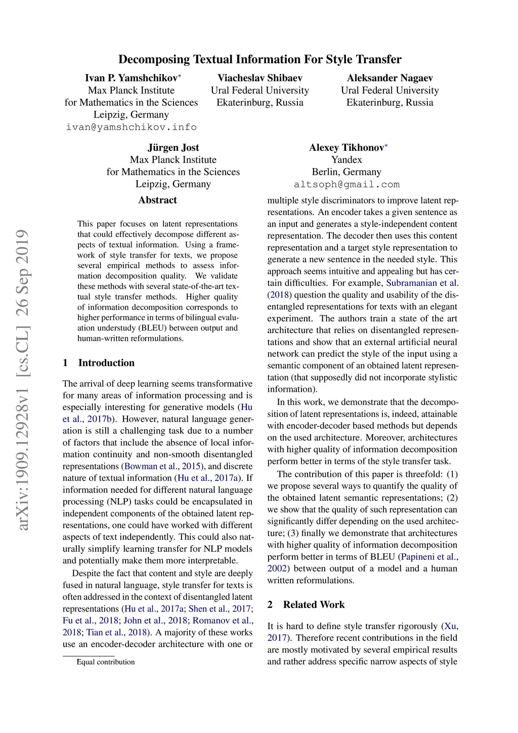 This paper focuses on latent representations that could effectively decompose different aspects of textual information. Using a framework of style transfer for texts, we propose several empirical methods to assess information decomposition quality. We validate these methods with several state-of-the-art textual style transfer methods. Higher quality of information decomposition corresponds to higher performance in terms of bilingual evaluation understudy (BLEU) between output and human-written reformulations.