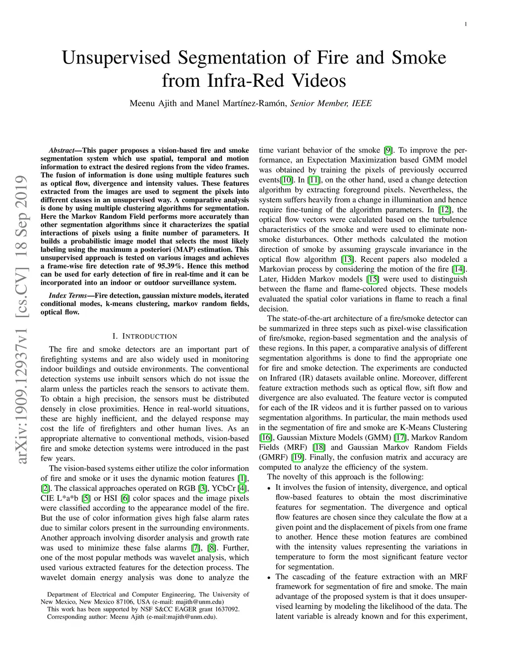 This paper proposes a vision-based fire and smoke segmentation system which use spatial, temporal and motion information to extract the desired regions from the video frames. The fusion of information is done using multiple features such as optical flow, divergence and intensity values. These features extracted from the images are used to segment the pixels into different classes in an unsupervised way. A comparative analysis is done by using multiple clustering algorithms for segmentation. Here the Markov Random Field performs more accurately than other segmentation algorithms since it characterizes the spatial interactions of pixels using a finite number of parameters. It builds a probabilistic image model that selects the most likely labeling using the maximum a posteriori (MAP) estimation. This unsupervised approach is tested on various images and achieves a frame-wise fire detection rate of 95.39%. Hence this method can be used for early detection of fire in real-time and it can be incorporated into an indoor or outdoor surveillance system.