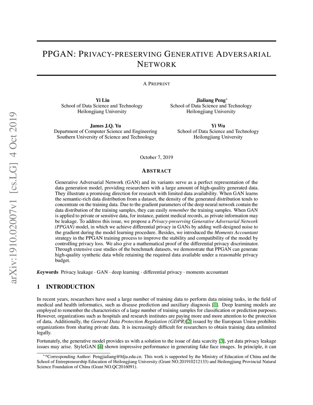 Generative Adversarial Network (GAN) and its variants serve as a perfect representation of the data generation model, providing researchers with a large amount of high-quality generated data. They illustrate a promising direction for research with limited data availability. When GAN learns the semantic-rich data distribution from a dataset, the density of the generated distribution tends to concentrate on the training data. Due to the gradient parameters of the deep neural network contain the data distribution of the training samples, they can easily remember the training samples. When GAN is applied to private or sensitive data, for instance, patient medical records, as private information may be leakage. To address this issue, we propose a Privacy-preserving Generative Adversarial Network (PPGAN) model, in which we achieve differential privacy in GANs by adding well-designed noise to the gradient during the model learning procedure. Besides, we introduced the Moments Accountant strategy in the PPGAN training process to improve the stability and compatibility of the model by controlling privacy loss. We also give a mathematical proof of the differential privacy discriminator. Through extensive case studies of the benchmark datasets, we demonstrate that PPGAN can generate high-quality synthetic data while retaining the required data available under a reasonable privacy budget.