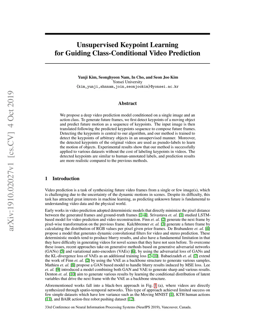 We propose a deep video prediction model conditioned on a single image and an action class. To generate future frames, we first detect keypoints of a moving object and predict future motion as a sequence of keypoints. The input image is then translated following the predicted keypoints sequence to compose future frames. Detecting the keypoints is central to our algorithm, and our method is trained to detect the keypoints of arbitrary objects in an unsupervised manner. Moreover, the detected keypoints of the original videos are used as pseudo-labels to learn the motion of objects. Experimental results show that our method is successfully applied to various datasets without the cost of labeling keypoints in videos. The detected keypoints are similar to human-annotated labels, and prediction results are more realistic compared to the previous methods.