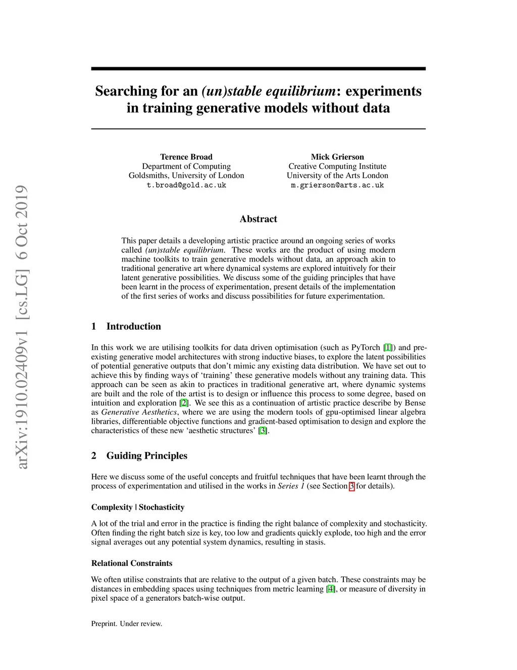 This paper details a developing artistic practice around an ongoing series of works called (un)stable equilibrium. These works are the product of using modern machine toolkits to train generative models without data, an approach akin to traditional generative art where dynamical systems are explored intuitively for their latent generative possibilities. We discuss some of the guiding principles that have been learnt in the process of experimentation, present details of the implementation of the first series of works and discuss possibilities for future experimentation.