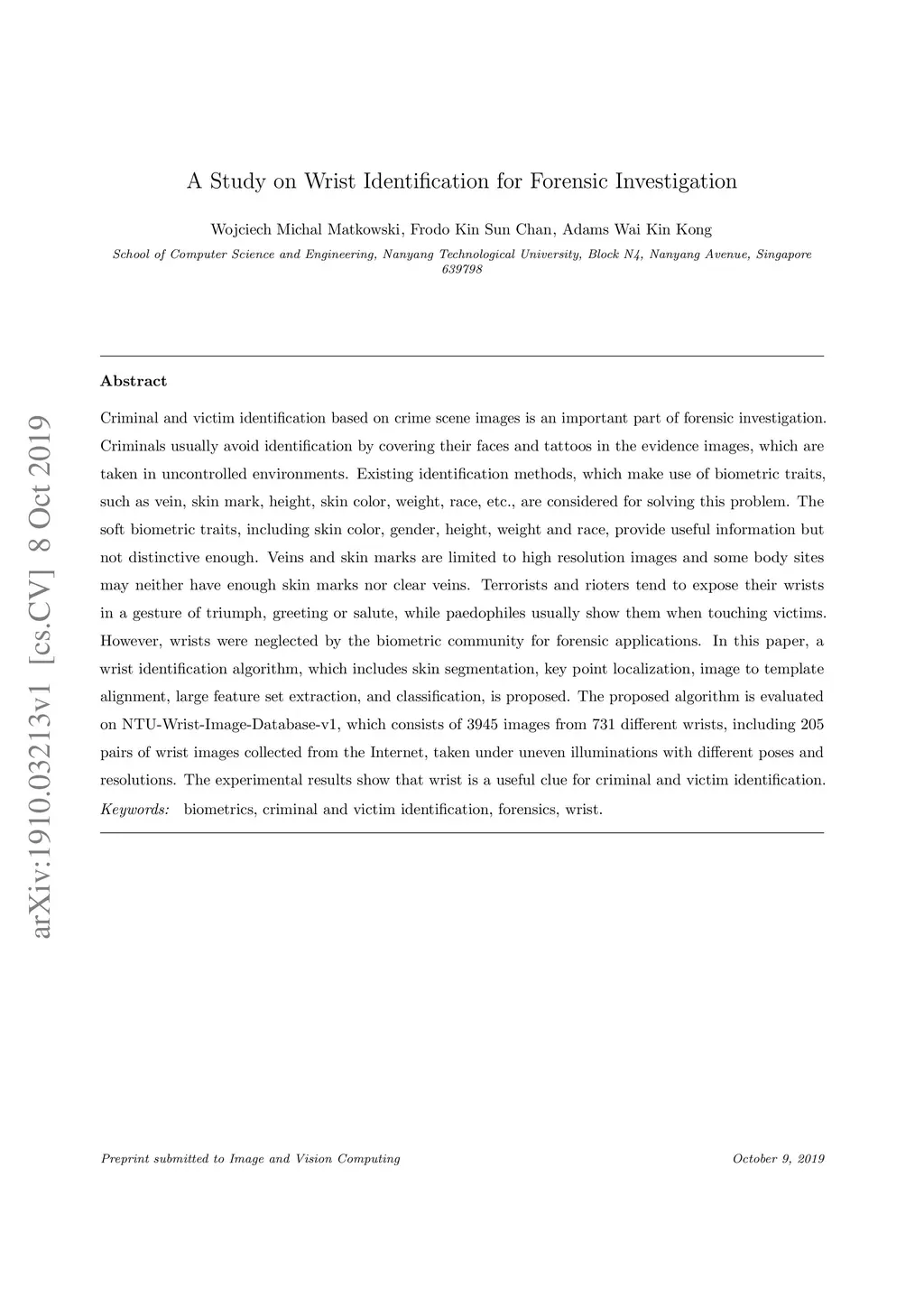 Criminal and victim identification based on crime scene images is an important part of forensic investigation. Criminals usually avoid identification by covering their faces and tattoos in the evidence images, which are taken in uncontrolled environments. Existing identification methods, which make use of biometric traits, such as vein, skin mark, height, skin color, weight, race, etc., are considered for solving this problem. The soft biometric traits, including skin color, gender, height, weight and race, provide useful information but not distinctive enough. Veins and skin marks are limited to high resolution images and some body sites may neither have enough skin marks nor clear veins. Terrorists and rioters tend to expose their wrists in a gesture of triumph, greeting or salute, while paedophiles usually show them when touching victims. However, wrists were neglected by the biometric community for forensic applications. In this paper, a wrist identification algorithm, which includes skin segmentation, key point localization, image to template alignment, large feature set extraction, and classification, is proposed. The proposed algorithm is evaluated on NTU-Wrist-Image-Database-v1, which consists of 3945 images from 731 different wrists, including 205 pairs of wrist images collected from the Internet, taken under uneven illuminations with different poses and resolutions. The experimental results show that wrist is a useful clue for criminal and victim identification. Keywords: biometrics, criminal and victim identification, forensics, wrist.