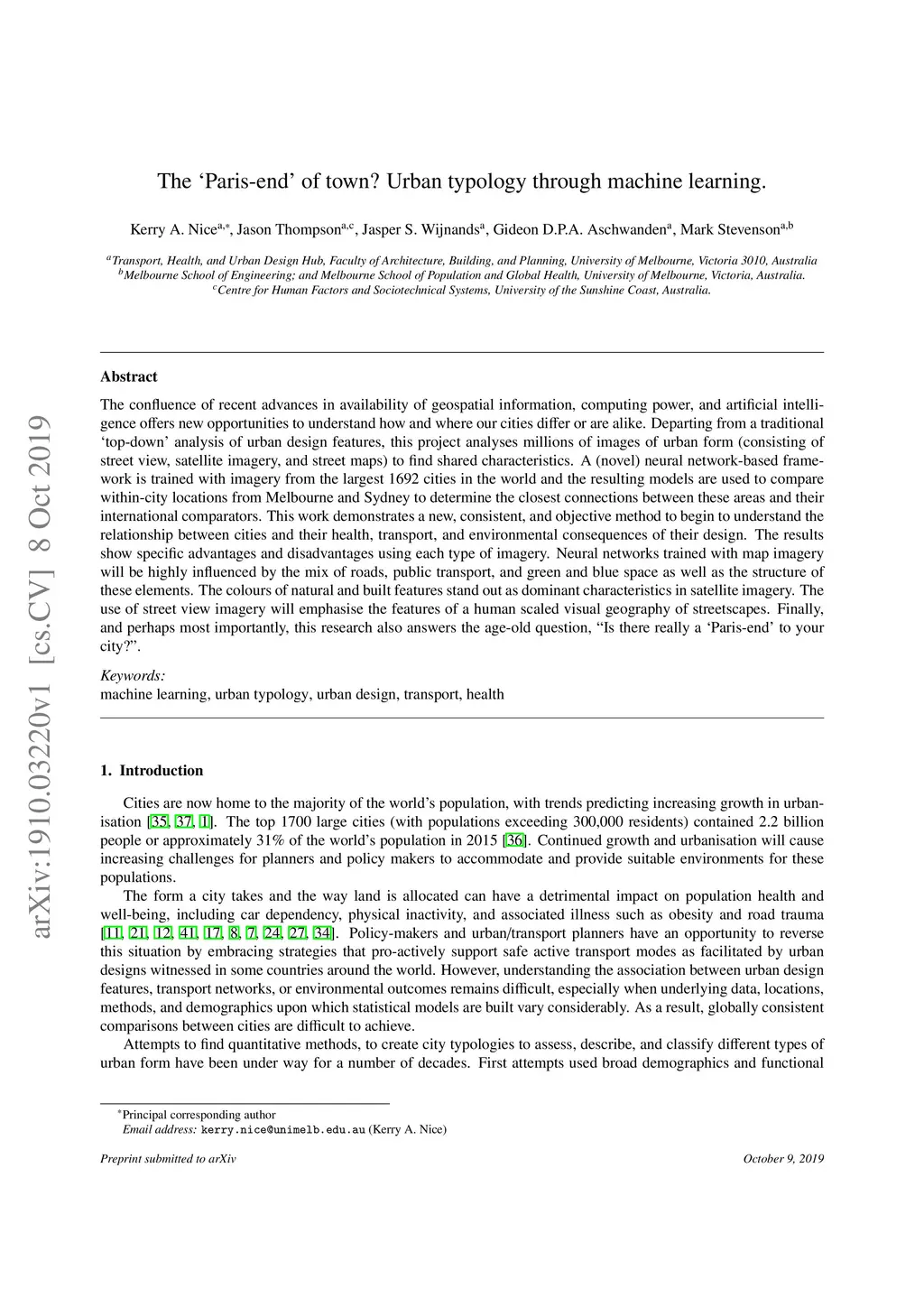The confluence of recent advances in availability of geospatial information, computing power, and artificial intelligence offers new opportunities to understand how and where our cities differ or are alike. Departing from a traditional `top-down' analysis of urban design features, this project analyses millions of images of urban form (consisting of street view, satellite imagery, and street maps) to find shared characteristics. A (novel) neural network-based framework is trained with imagery from the largest 1692 cities in the world and the resulting models are used to compare within-city locations from Melbourne and Sydney to determine the closest connections between these areas and their international comparators. This work demonstrates a new, consistent, and objective method to begin to understand the relationship between cities and their health, transport, and environmental consequences of their design. The results show specific advantages and disadvantages using each type of imagery. Neural networks trained with map imagery will be highly influenced by the mix of roads, public transport, and green and blue space as well as the structure of these elements. The colours of natural and built features stand out as dominant characteristics in satellite imagery. The use of street view imagery will emphasise the features of a human scaled visual geography of streetscapes. Finally, and perhaps most importantly, this research also answers the age-old question, ``Is there really a `Paris-end' to your city?''.