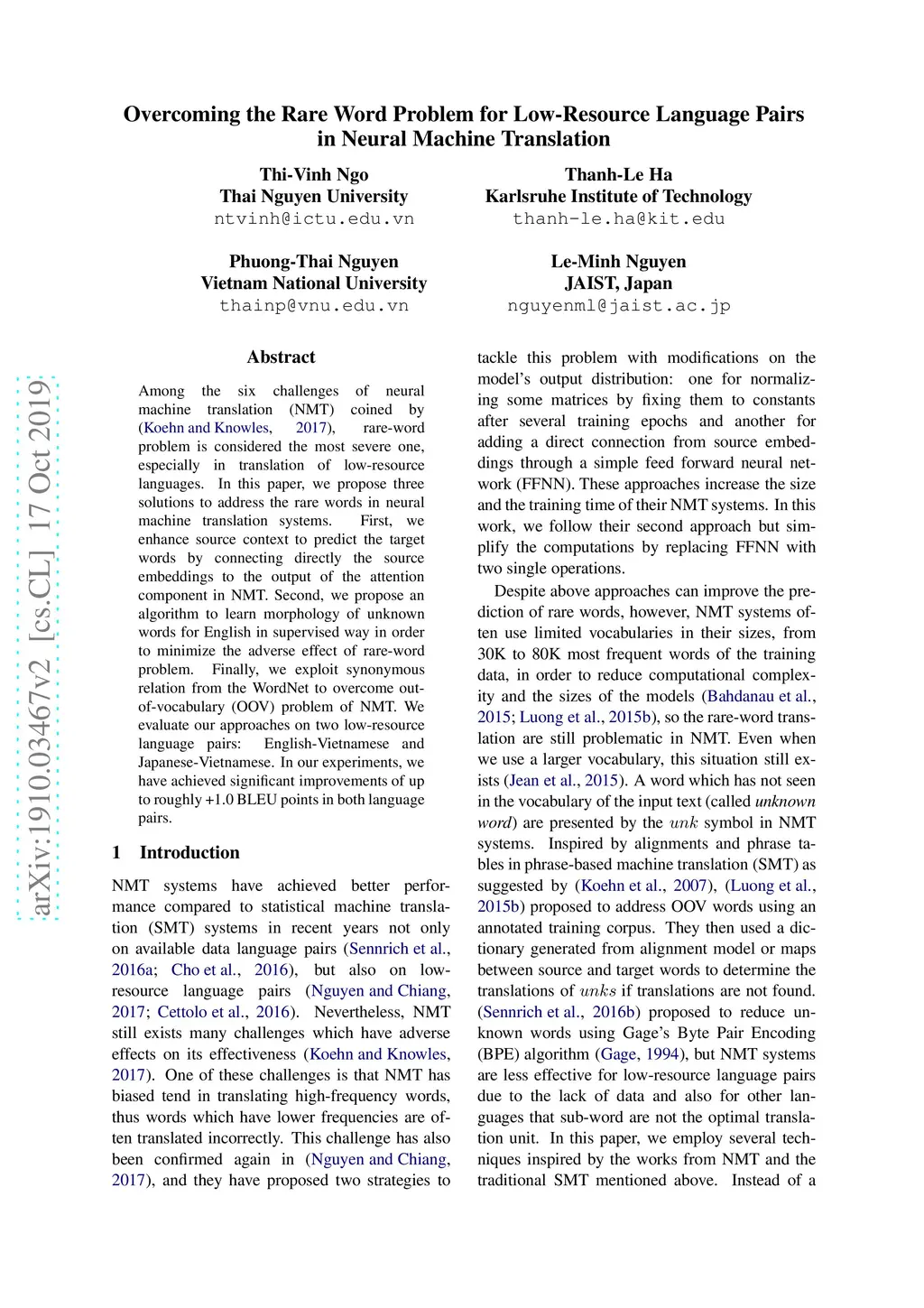 Among the six challenges of neural machine translation (NMT) coined by (Koehn and Knowles, 2017), rare-word problem is considered the most severe one, especially in translation of low-resource languages. In this paper, we propose three solutions to address the rare words in neural machine translation systems. First, we enhance source context to predict the target words by connecting directly the source embeddings to the output of the attention component in NMT. Second, we propose an algorithm to learn morphology of unknown words for English in supervised way in order to minimize the adverse effect of rare-word problem. Finally, we exploit synonymous relation from the WordNet to overcome out-of-vocabulary (OOV) problem of NMT. We evaluate our approaches on two low-resource language pairs: English-Vietnamese and Japanese-Vietnamese. In our experiments, we have achieved significant improvements of up to roughly +1.0 BLEU points in both language pairs.