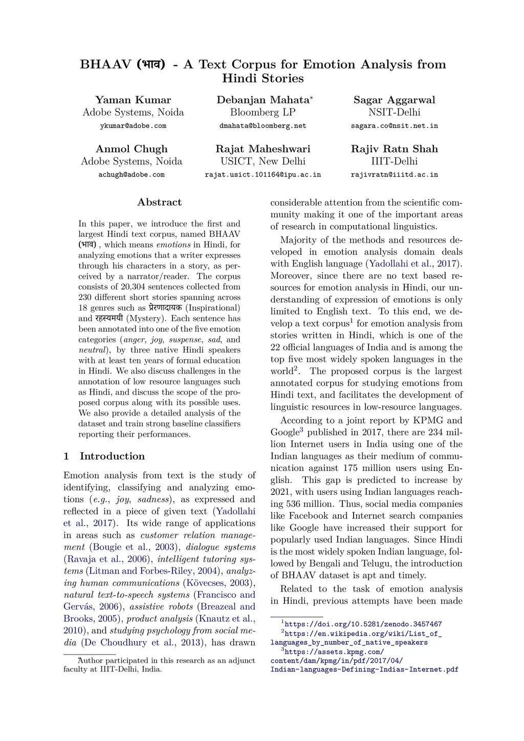 BHAAV- A Text Corpus for Emotion Analysis from Hindi Stories
