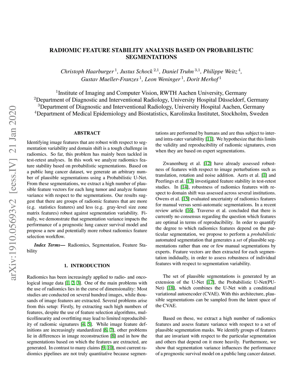 Identifying image features that are robust with respect to segmentation variability and domain shift is a tough challenge in radiomics. So far, this problem has mainly been tackled in test-retest analyses. In this work we analyze radiomics feature stability based on probabilistic segmentations. Based on a public lung cancer dataset, we generate an arbitrary number of plausible segmentations using a Probabilistic U-Net. From these segmentations, we extract a high number of plausible feature vectors for each lung tumor and analyze feature variance with respect to the segmentations. Our results suggest that there are groups of radiomic features that are more (e.g. statistics features) and less (e.g. gray-level size zone matrix features) robust against segmentation variability. Finally, we demonstrate that segmentation variance impacts the performance of a prognostic lung cancer survival model and propose a new and potentially more robust radiomics feature selection workflow.