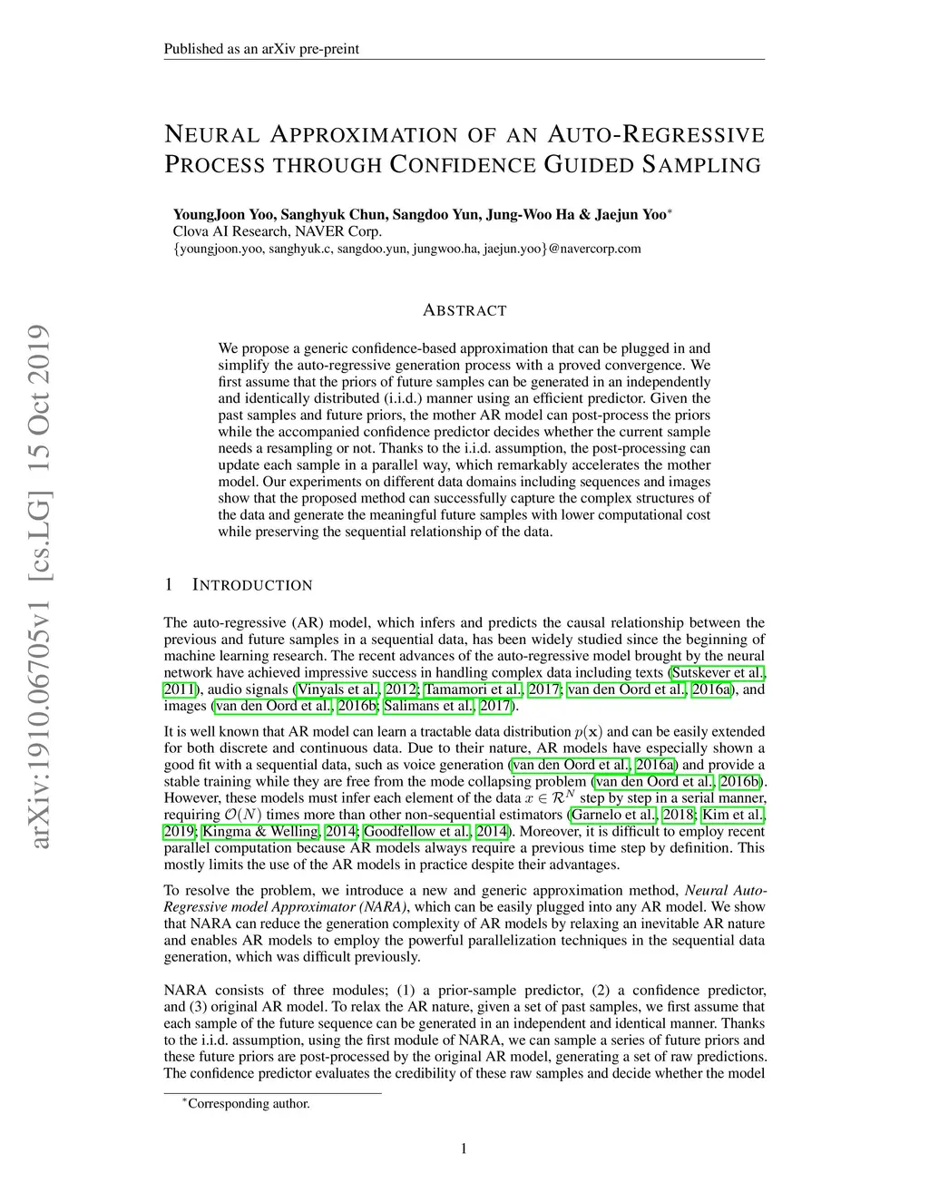 We propose a generic confidence-based approximation that can be plugged in and simplify the auto-regressive generation process with a proved convergence. We first assume that the priors of future samples can be generated in an independently and identically distributed (i.i.d.) manner using an efficient predictor. Given the past samples and future priors, the mother AR model can post-process the priors while the accompanied confidence predictor decides whether the current sample needs a resampling or not. Thanks to the i.i.d. assumption, the post-processing can update each sample in a parallel way, which remarkably accelerates the mother model. Our experiments on different data domains including sequences and images show that the proposed method can successfully capture the complex structures of the data and generate the meaningful future samples with lower computational cost while preserving the sequential relationship of the data.