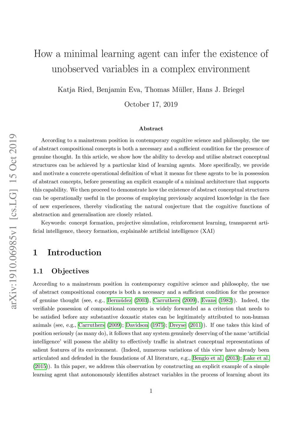 According to a mainstream position in contemporary cognitive science and philosophy, the use of abstract compositional concepts is both a necessary and a sufficient condition for the presence of genuine thought. In this article, we show how the ability to develop and utilise abstract conceptual structures can be achieved by a particular kind of learning agents. More specifically, we provide and motivate a concrete operational definition of what it means for these agents to be in possession of abstract concepts, before presenting an explicit example of a minimal architecture that supports this capability. We then proceed to demonstrate how the existence of abstract conceptual structures can be operationally useful in the process of employing previously acquired knowledge in the face of new experiences, thereby vindicating the natural conjecture that the cognitive functions of abstraction and generalisation are closely related. Keywords: concept formation, projective simulation, reinforcement learning, transparent artificial intelligence, theory formation, explainable artificial intelligence (XAI)