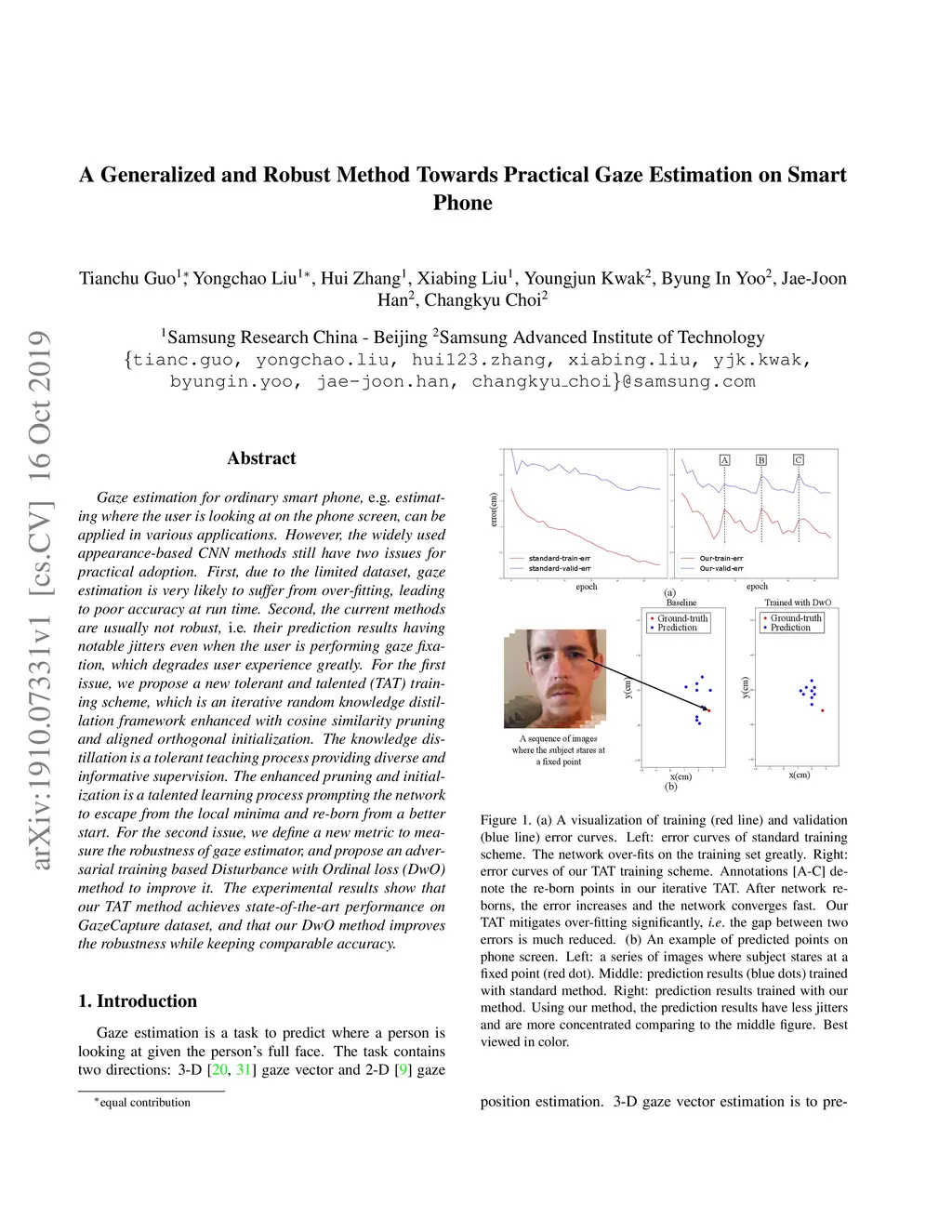 Gaze estimation for ordinary smart phone, e.g. estimating where the user is looking at on the phone screen, can be applied in various applications. However, the widely used appearance-based CNN methods still have two issues for practical adoption. First, due to the limited dataset, gaze estimation is very likely to suffer from over-fitting, leading to poor accuracy at run time. Second, the current methods are usually not robust, i.e. their prediction results having notable jitters even when the user is performing gaze fixation, which degrades user experience greatly. For the first issue, we propose a new tolerant and talented (TAT) training scheme, which is an iterative random knowledge distillation framework enhanced with cosine similarity pruning and aligned orthogonal initialization. The knowledge distillation is a tolerant teaching process providing diverse and informative supervision. The enhanced pruning and initialization is a talented learning process prompting the network to escape from the local minima and re-born from a better start. For the second issue, we define a new metric to measure the robustness of gaze estimator, and propose an adversarial training based Disturbance with Ordinal loss (DwO) method to improve it. The experimental results show that our TAT method achieves state-of-the-art performance on GazeCapture dataset, and that our DwO method improves the robustness while keeping comparable accuracy.