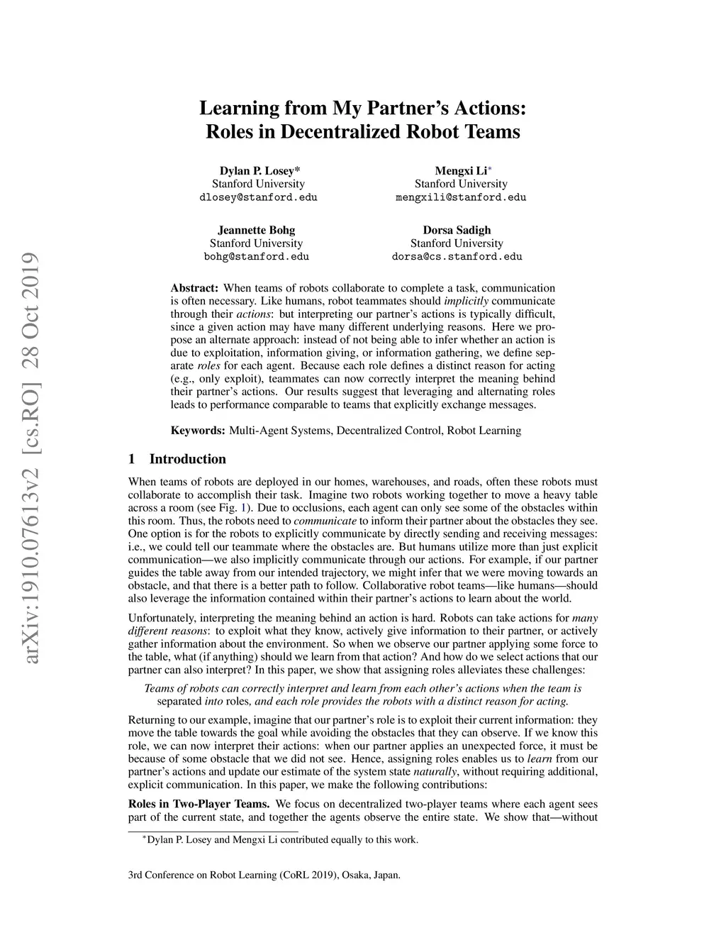 When teams of robots collaborate to complete a task, communication is often necessary. Like humans, robot teammates should implicitly communicate through their actions: but interpreting our partner's actions is typically difficult, since a given action may have many different underlying reasons. Here we propose an alternate approach: instead of not being able to infer whether an action is due to exploration, exploitation, or communication, we define separate roles for each agent. Because each role defines a distinct reason for acting (e.g., only exploit, only communicate), teammates now correctly interpret the meaning behind their partner's actions. Our results suggest that leveraging and alternating roles leads to performance comparable to teams that explicitly exchange messages. You can find more images and videos of our experimental setups at http://ai.stanford.edu/blog/learning-from-partners/.