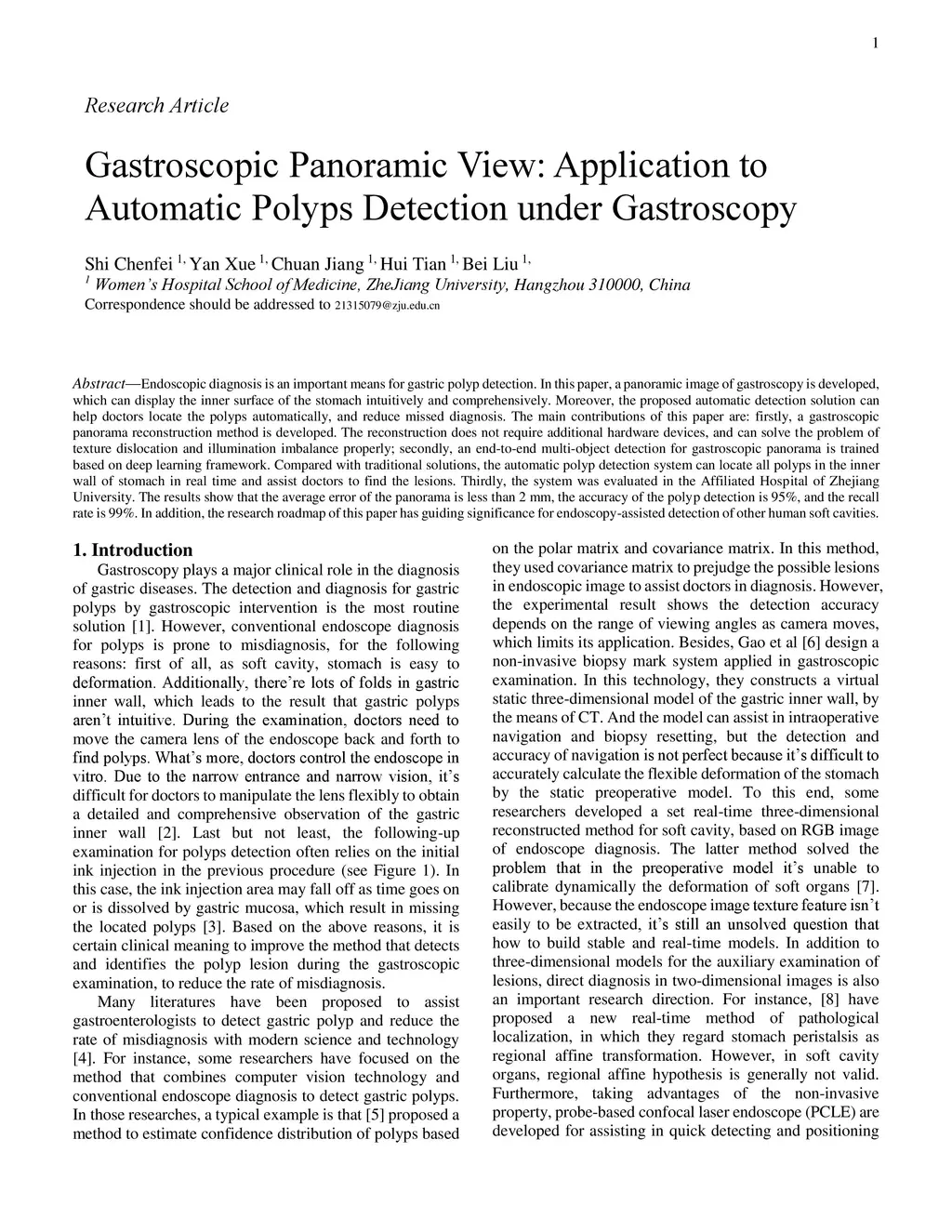 Endoscopic diagnosis is an important means for gastric polyp detection. In this paper, a panoramic image of gastroscopy is developed, which can display the inner surface of the stomach intuitively and comprehensively. Moreover, the proposed automatic detection solution can help doctors locate the polyps automatically, and reduce missed diagnosis. The main contributions of this paper are: firstly, a gastroscopic panorama reconstruction method is developed. The reconstruction does not require additional hardware devices, and can solve the problem of texture dislocation and illumination imbalance properly; secondly, an end-to-end multi-object detection for gastroscopic panorama is trained based on deep learning framework. Compared with traditional solutions, the automatic polyp detection system can locate all polyps in the inner wall of stomach in real time and assist doctors to find the lesions. Thirdly, the system was evaluated in the Affiliated Hospital of Zhejiang University. The results show that the average error of the panorama is less than 2 mm, the accuracy of the polyp detection is 95%, and the recall rate is 99%. In addition, the research roadmap of this paper has guiding significance for endoscopy-assisted detection of other human soft cavities.