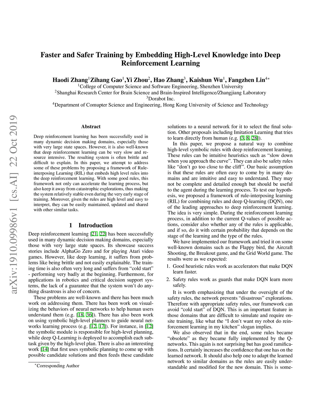 Deep reinforcement learning has been successfully used in many dynamic decision making domains, especially those with very large state spaces. However, it is also well-known that deep reinforcement learning can be very slow and resource intensive. The resulting system is often brittle and difficult to explain. In this paper, we attempt to address some of these problems by proposing a framework of Rule-interposing Learning (RIL) that embeds high level rules into the deep reinforcement learning. With some good rules, this framework not only can accelerate the learning process, but also keep it away from catastrophic explorations, thus making the system relatively stable even during the very early stage of training. Moreover, given the rules are high level and easy to interpret, they can be easily maintained, updated and shared with other similar tasks.
