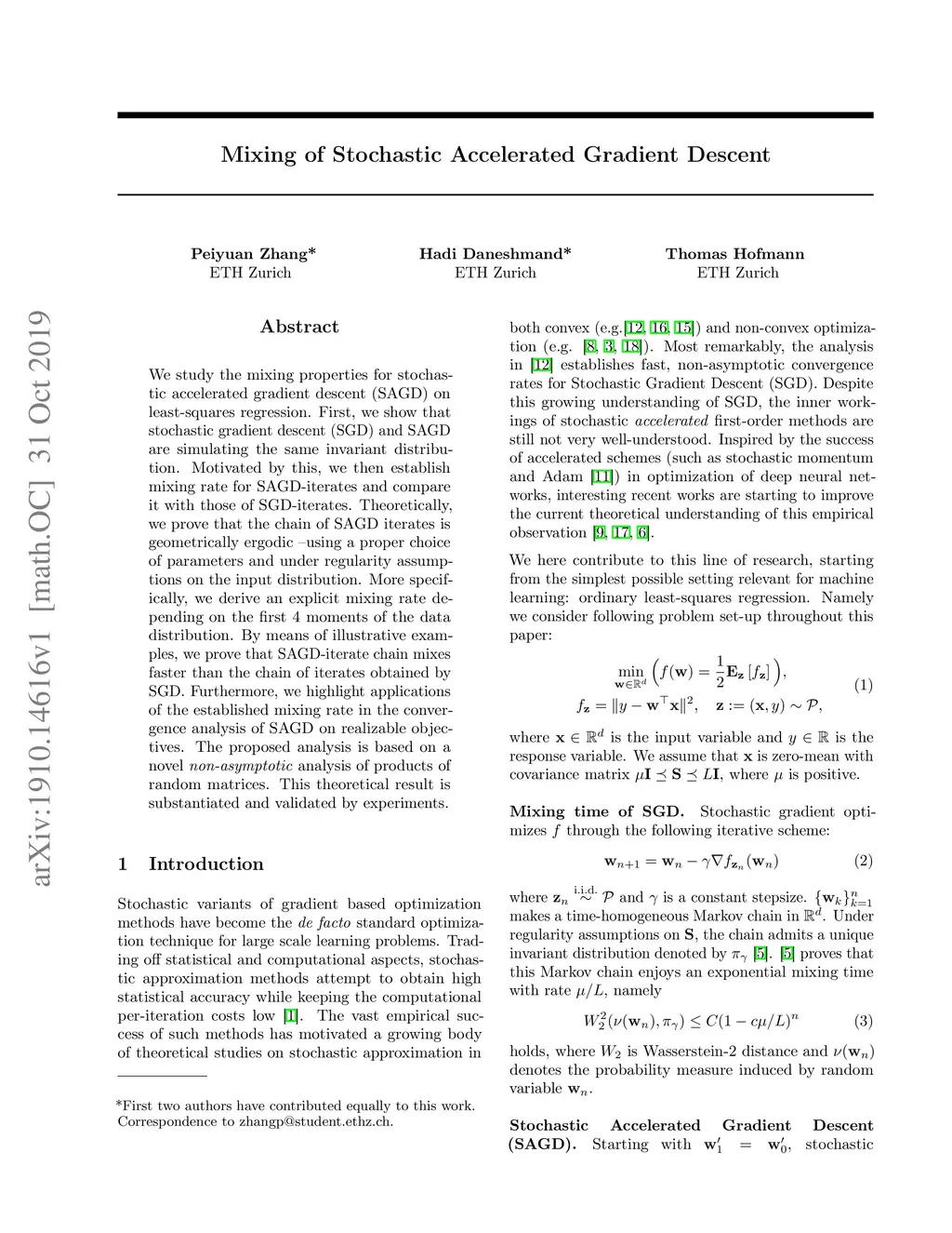 We study the mixing properties for stochastic accelerated gradient descent (SAGD) on least-squares regression. First, we show that stochastic gradient descent (SGD) and SAGD are simulating the same invariant distribution. Motivated by this, we then establish mixing rate for SAGD-iterates and compare it with those of SGD-iterates. Theoretically, we prove that the chain of SAGD iterates is geometrically ergodic --using a proper choice of parameters and under regularity assumptions on the input distribution. More specifically, we derive an explicit mixing rate depending on the first 4 moments of the data distribution. By means of illustrative examples, we prove that SAGD-iterate chain mixes faster than the chain of iterates obtained by SGD. Furthermore, we highlight applications of the established mixing rate in the convergence analysis of SAGD on realizable objectives. The proposed analysis is based on a novel non-asymptotic analysis of products of random matrices. This theoretical result is substantiated and validated by experiments.