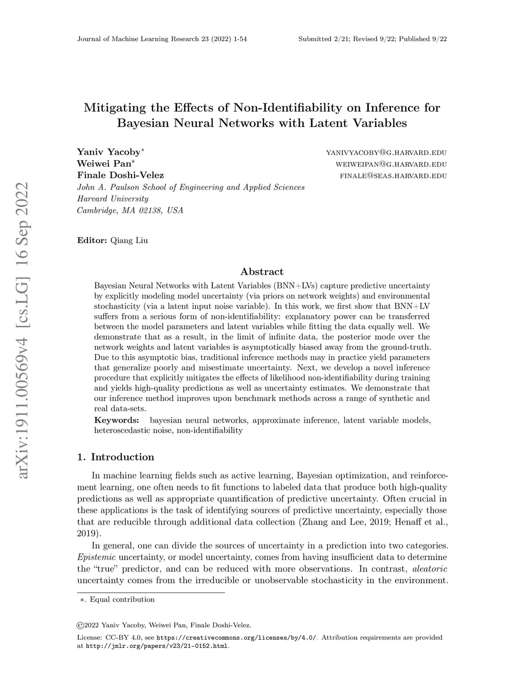 Bayesian Neural Networks with Latent Variables (BNN+LVs) capture predictive uncertainty by explicitly modeling model uncertainty (via priors on network weights) and environmental stochasticity (via a latent input noise variable). In this work, we first show that BNN+LV suffers from a serious form of non-identifiability: explanatory power can be transferred between the model parameters and latent variables while fitting the data equally well. We demonstrate that as a result, in the limit of infinite data, the posterior mode over the network weights and latent variables is asymptotically biased away from the ground-truth. Due to this asymptotic bias, traditional inference methods may in practice yield parameters that generalize poorly and misestimate uncertainty. Next, we develop a novel inference procedure that explicitly mitigates the effects of likelihood non-identifiability during training and yields high-quality predictions as well as uncertainty estimates. We demonstrate that our inference method improves upon benchmark methods across a range of synthetic and real data-sets.