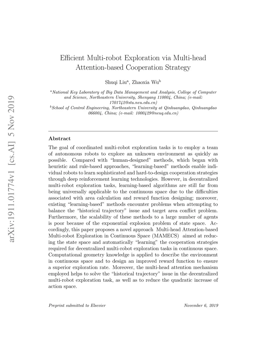 The goal of coordinated multi-robot exploration tasks is to employ a team of autonomous robots to explore an unknown environment as quickly as possible. Compared with human-designed methods, which began with heuristic and rule-based approaches, learning-based methods enable individual robots to learn sophisticated and hard-to-design cooperation strategies through deep reinforcement learning technologies. However, in decentralized multi-robot exploration tasks, learning-based algorithms are still far from being universally applicable to the continuous space due to the difficulties associated with area calculation and reward function designing; moreover, existing learning-based methods encounter problems when attempting to balance the historical trajectory issue and target area conflict problem. Furthermore, the scalability of these methods to a large number of agents is poor because of the exponential explosion problem of state space. Accordingly, this paper proposes a novel approach - Multi-head Attention-based Multi-robot Exploration in Continuous Space (MAMECS) - aimed at reducing the state space and automatically learning the cooperation strategies required for decentralized multi-robot exploration tasks in continuous space. Computational geometry knowledge is applied to describe the environment in continuous space and to design an improved reward function to ensure a superior exploration rate. Moreover, the multi-head attention mechanism employed helps to solve the historical trajectory issue in the decentralized multi-robot exploration task, as well as to reduce the quadratic increase of action space.
