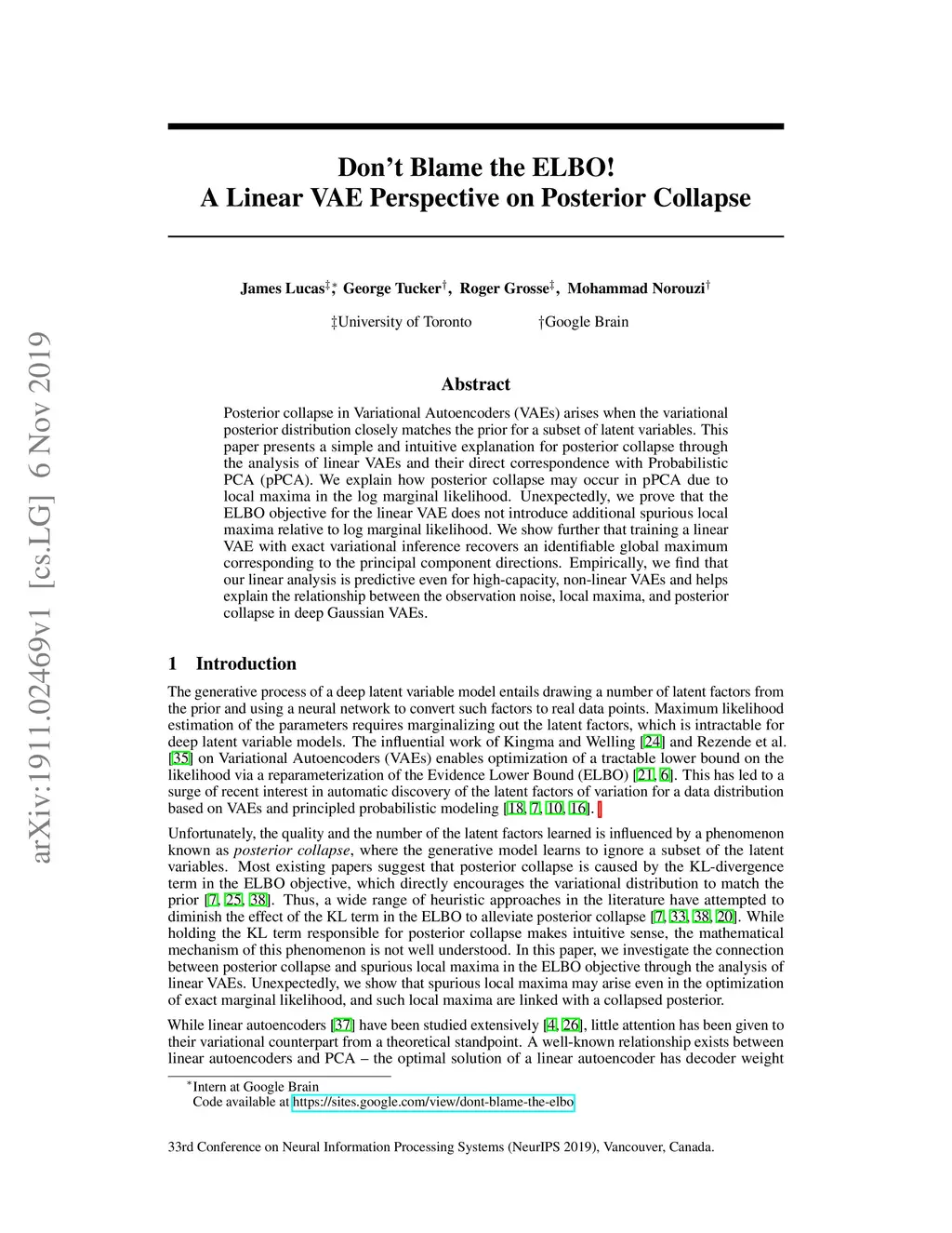 Posterior collapse in Variational Autoencoders (VAEs) arises when the variational posterior distribution closely matches the prior for a subset of latent variables. This paper presents a simple and intuitive explanation for posterior collapse through the analysis of linear VAEs and their direct correspondence with Probabilistic PCA (pPCA). We explain how posterior collapse may occur in pPCA due to local maxima in the log marginal likelihood. Unexpectedly, we prove that the ELBO objective for the linear VAE does not introduce additional spurious local maxima relative to log marginal likelihood. We show further that training a linear VAE with exact variational inference recovers an identifiable global maximum corresponding to the principal component directions. Empirically, we find that our linear analysis is predictive even for high-capacity, non-linear VAEs and helps explain the relationship between the observation noise, local maxima, and posterior collapse in deep Gaussian VAEs.