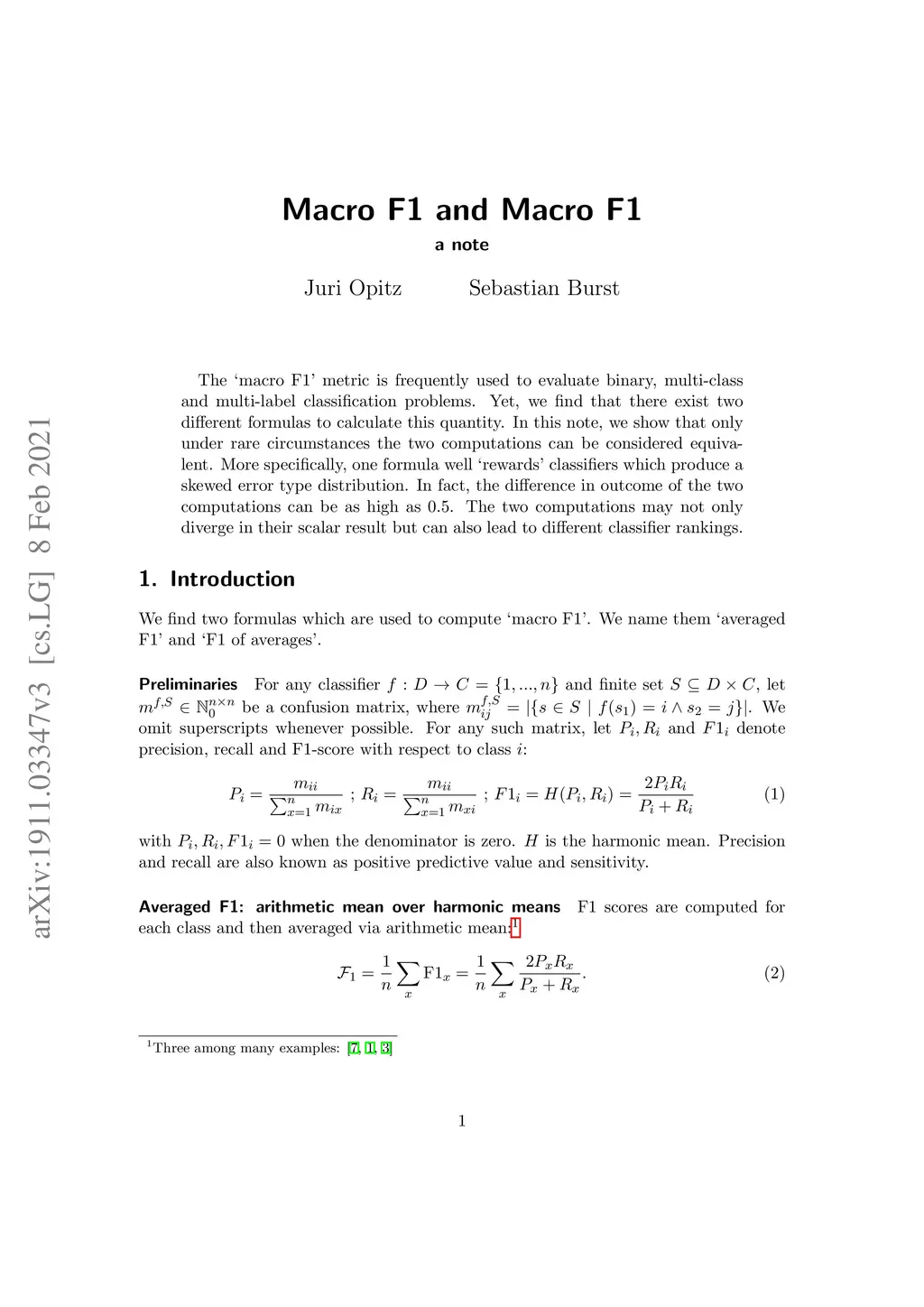 The 'macro F1' metric is frequently used to evaluate binary, multi-class and multi-label classification problems. Yet, we find that there exist two different formulas to calculate this quantity. In this note, we show that only under rare circumstances the two computations can be considered equivalent. More specifically, one formula well 'rewards' classifiers which produce a skewed error type distribution. In fact, the difference in outcome of the two computations can be as high as 0.5. The two computations may not only diverge in their scalar result but can also lead to different classifier rankings.