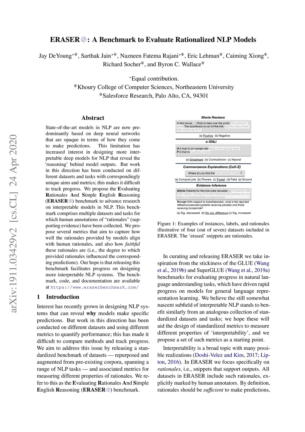ERASER: A Benchmark to Evaluate Rationalized NLP Models