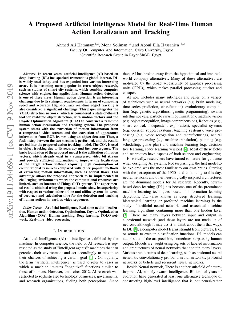 In recent years, artificial intelligence (AI) based on deep learning (DL) has sparked tremendous global interest. DL is widely used today and has expanded into various interesting areas. It is becoming more popular in cross-subject research, such as studies of smart city systems, which combine computer science with engineering applications. Human action detection is one of these areas. Human action detection is an interesting challenge due to its stringent requirements in terms of computing speed and accuracy. High-accuracy real-time object tracking is also considered a significant challenge. This paper integrates the YOLO detection network, which is considered a state-of-the-art tool for real-time object detection, with motion vectors and the Coyote Optimization Algorithm (COA) to construct a real-time human action localization and tracking system. The proposed system starts with the extraction of motion information from a compressed video stream and the extraction of appearance information from RGB frames using an object detector. Then, a fusion step between the two streams is performed, and the results are fed into the proposed action tracking model. The COA is used in object tracking due to its accuracy and fast convergence. The basic foundation of the proposed model is the utilization of motion vectors, which already exist in a compressed video bit stream and provide sufficient information to improve the localization of the target action without requiring high consumption of computational resources compared with other popular methods of extracting motion information, such as optical flows. This advantage allows the proposed approach to be implemented in challenging environments where the computational resources are limited, such as Internet of Things (IoT) systems.