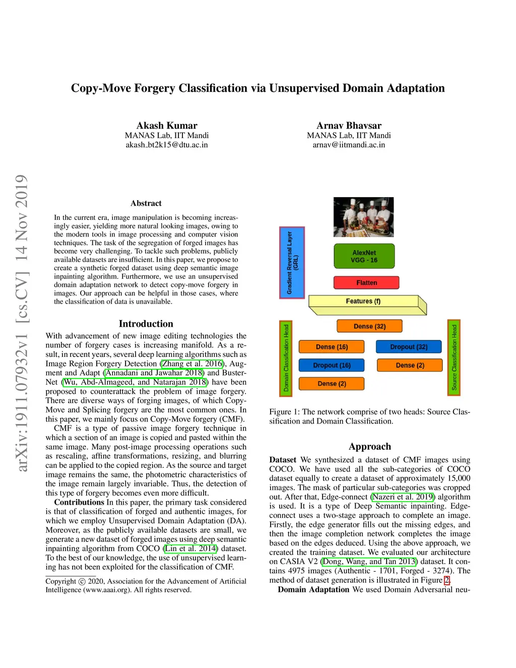 In the current era, image manipulation is becoming increasingly easier, yielding more natural looking images, owing to the modern tools in image processing and computer vision techniques. The task of the segregation of forged images has become very challenging. To tackle such problems, publicly available datasets are insufficient. In this paper, we propose to create a synthetic forged dataset using deep semantic image inpainting algorithm. Furthermore, we use an unsupervised domain adaptation network to detect copy-move forgery in images. Our approach can be helpful in those cases, where the classification of data is unavailable.