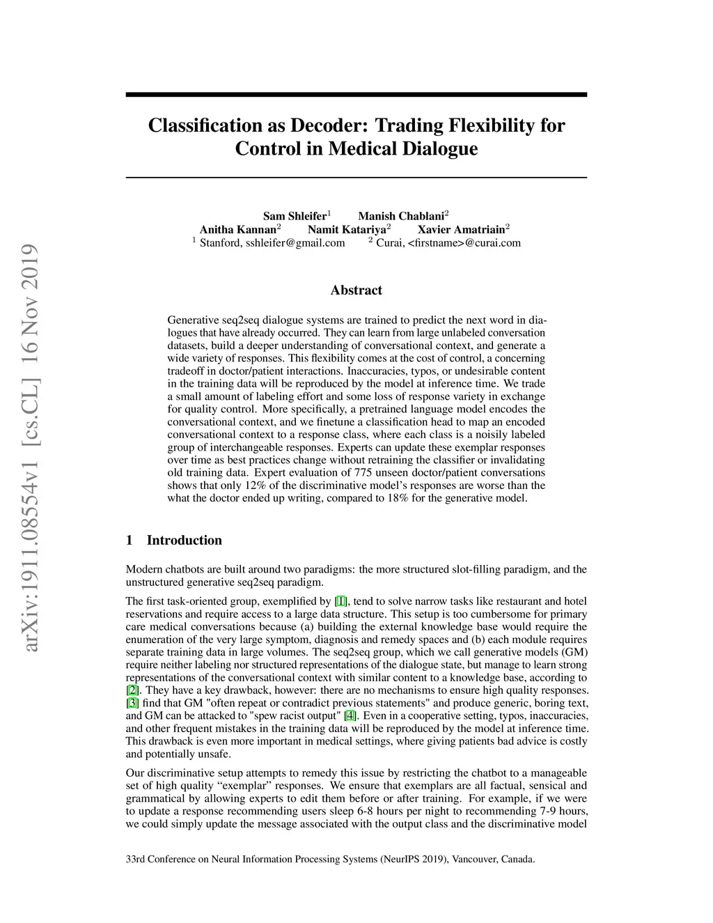 Generative seq2seq dialogue systems are trained to predict the next word in dialogues that have already occurred. They can learn from large unlabeled conversation datasets, build a deeper understanding of conversational context, and generate a wide variety of responses. This flexibility comes at the cost of control, a concerning tradeoff in doctor/patient interactions. Inaccuracies, typos, or undesirable content in the training data will be reproduced by the model at inference time. We trade a small amount of labeling effort and some loss of response variety in exchange for quality control. More specifically, a pretrained language model encodes the conversational context, and we finetune a classification head to map an encoded conversational context to a response class, where each class is a noisily labeled group of interchangeable responses. Experts can update these exemplar responses over time as best practices change without retraining the classifier or invalidating old training data. Expert evaluation of 775 unseen doctor/patient conversations shows that only 12% of the discriminative model's responses are worse than the what the doctor ended up writing, compared to 18% for the generative model.