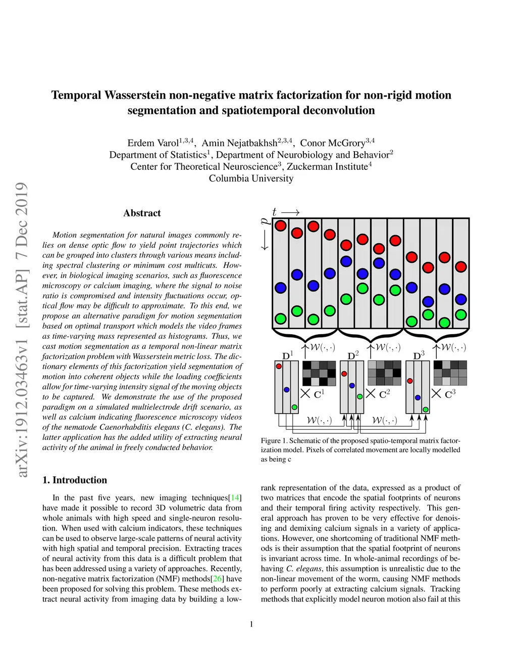 Motion segmentation for natural images commonly relies on dense optic flow to yield point trajectories which can be grouped into clusters through various means including spectral clustering or minimum cost multicuts. However, in biological imaging scenarios, such as fluorescence microscopy or calcium imaging, where the signal to noise ratio is compromised and intensity fluctuations occur, optical flow may be difficult to approximate. To this end, we propose an alternative paradigm for motion segmentation based on optimal transport which models the video frames as time-varying mass represented as histograms. Thus, we cast motion segmentation as a temporal non-linear matrix factorization problem with Wasserstein metric loss. The dictionary elements of this factorization yield segmentation of motion into coherent objects while the loading coefficients allow for time-varying intensity signal of the moving objects to be captured. We demonstrate the use of the proposed paradigm on a simulated multielectrode drift scenario, as well as calcium indicating fluorescence microscopy videos of the nematode Caenorhabditis elegans (C. elegans). The latter application has the added utility of extracting neural activity of the animal in freely conducted behavior.