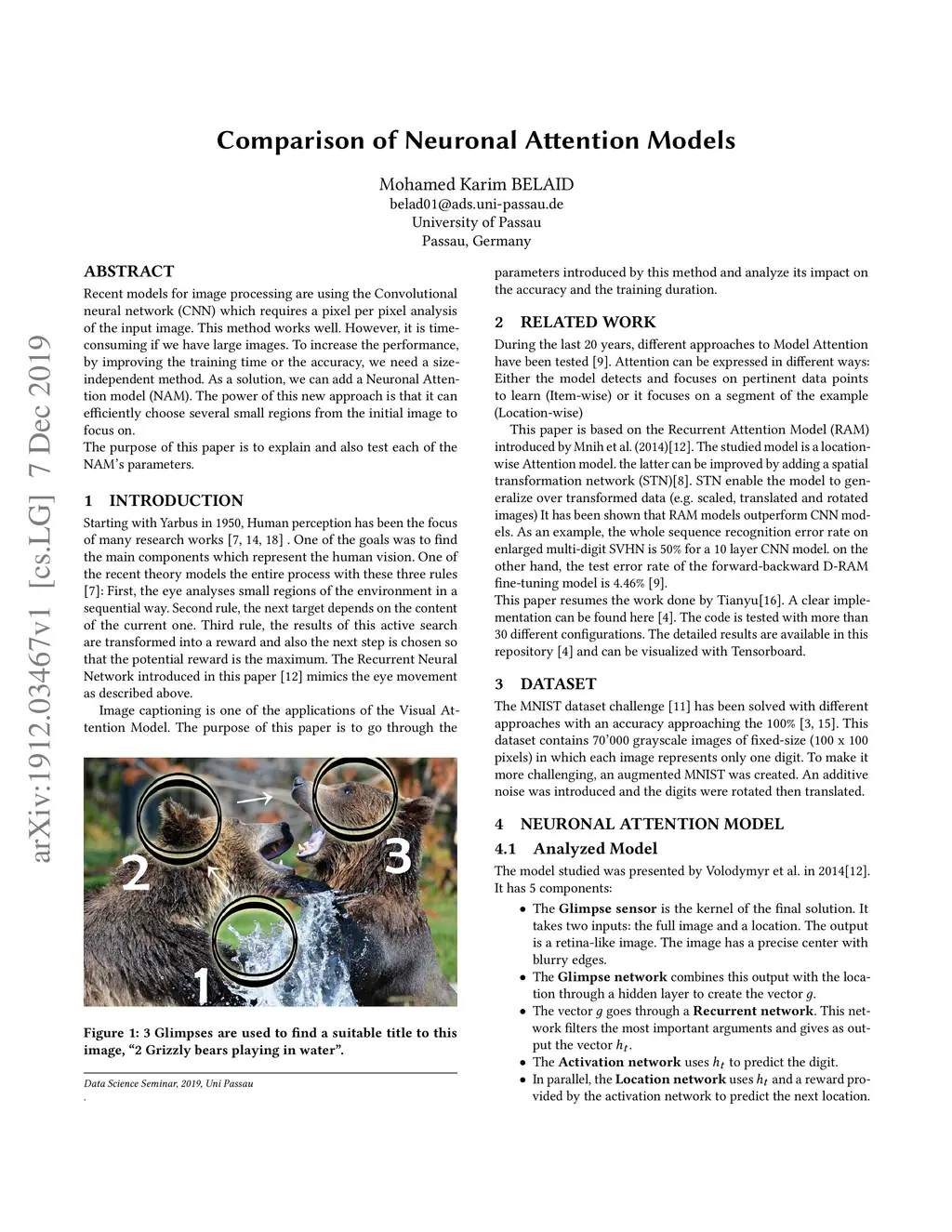 Recent models for image processing are using the Convolutional neural network (CNN) which requires a pixel per pixel analysis of the input image. This method works well. However, it is time-consuming if we have large images. To increase the performance, by improving the training time or the accuracy, we need a size-independent method. As a solution, we can add a Neuronal Attention model (NAM). The power of this new approach is that it can efficiently choose several small regions from the initial image to focus on. The purpose of this paper is to explain and also test each of the NAM's parameters.