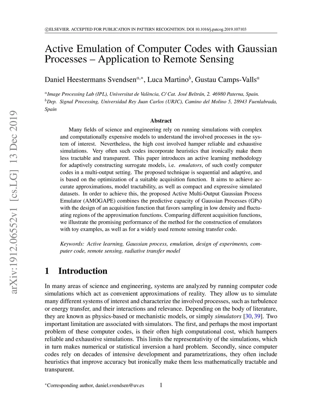 Many fields of science and engineering rely on running simulations with complex and computationally expensive models to understand the involved processes in the system of interest. Nevertheless, the high cost involved hamper reliable and exhaustive simulations. Very often such codes incorporate heuristics that ironically make them less tractable and transparent. This paper introduces an active learning methodology for adaptively constructing surrogate models, i.e. emulators, of such costly computer codes in a multi-output setting. The proposed technique is sequential and adaptive, and is based on the optimization of a suitable acquisition function. It aims to achieve accurate approximations, model tractability, as well as compact and expressive simulated datasets. In order to achieve this, the proposed Active Multi-Output Gaussian Process Emulator (AMOGAPE) combines the predictive capacity of Gaussian Processes (GPs) with the design of an acquisition function that favors sampling in low density and fluctuating regions of the approximation functions. Comparing different acquisition functions, we illustrate the promising performance of the method for the construction of emulators with toy examples, as well as for a widely used remote sensing transfer code.