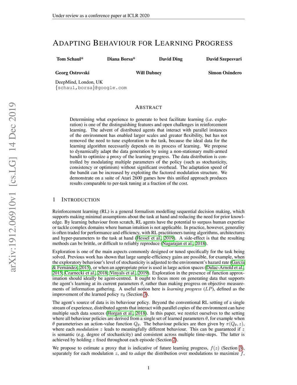 Determining what experience to generate to best facilitate learning (i.e. exploration) is one of the distinguishing features and open challenges in reinforcement learning. The advent of distributed agents that interact with parallel instances of the environment has enabled larger scales and greater flexibility, but has not removed the need to tune exploration to the task, because the ideal data for the learning algorithm necessarily depends on its process of learning. We propose to dynamically adapt the data generation by using a non-stationary multi-armed bandit to optimize a proxy of the learning progress. The data distribution is controlled by modulating multiple parameters of the policy (such as stochasticity, consistency or optimism) without significant overhead. The adaptation speed of the bandit can be increased by exploiting the factored modulation structure. We demonstrate on a suite of Atari 2600 games how this unified approach produces results comparable to per-task tuning at a fraction of the cost.