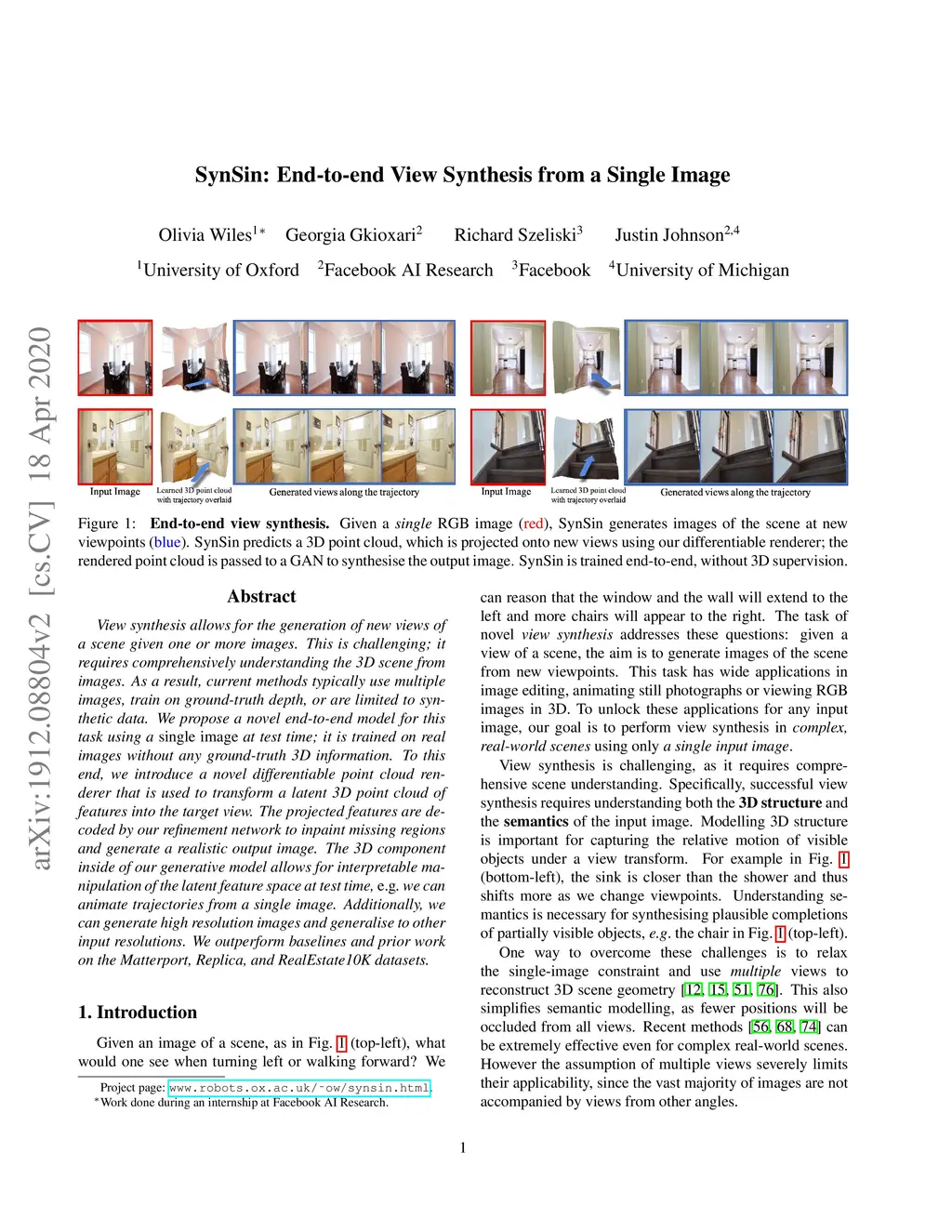 SynSin: End-to-end View Synthesis from a Single Image