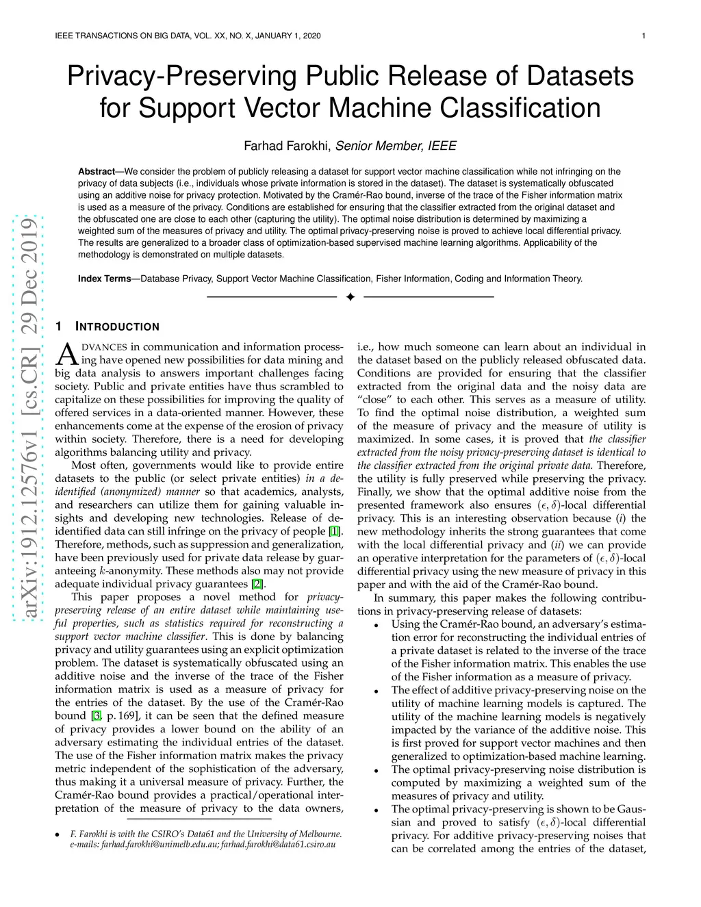 We consider the problem of publicly releasing a dataset for support vector machine classification while not infringing on the privacy of data subjects (i.e., individuals whose private information is stored in the dataset). The dataset is systematically obfuscated using an additive noise for privacy protection. Motivated by the Cramer-Rao bound, inverse of the trace of the Fisher information matrix is used as a measure of the privacy. Conditions are established for ensuring that the classifier extracted from the original dataset and the obfuscated one are close to each other (capturing the utility). The optimal noise distribution is determined by maximizing a weighted sum of the measures of privacy and utility. The optimal privacy-preserving noise is proved to achieve local differential privacy. The results are generalized to a broader class of optimization-based supervised machine learning algorithms. Applicability of the methodology is demonstrated on multiple datasets.