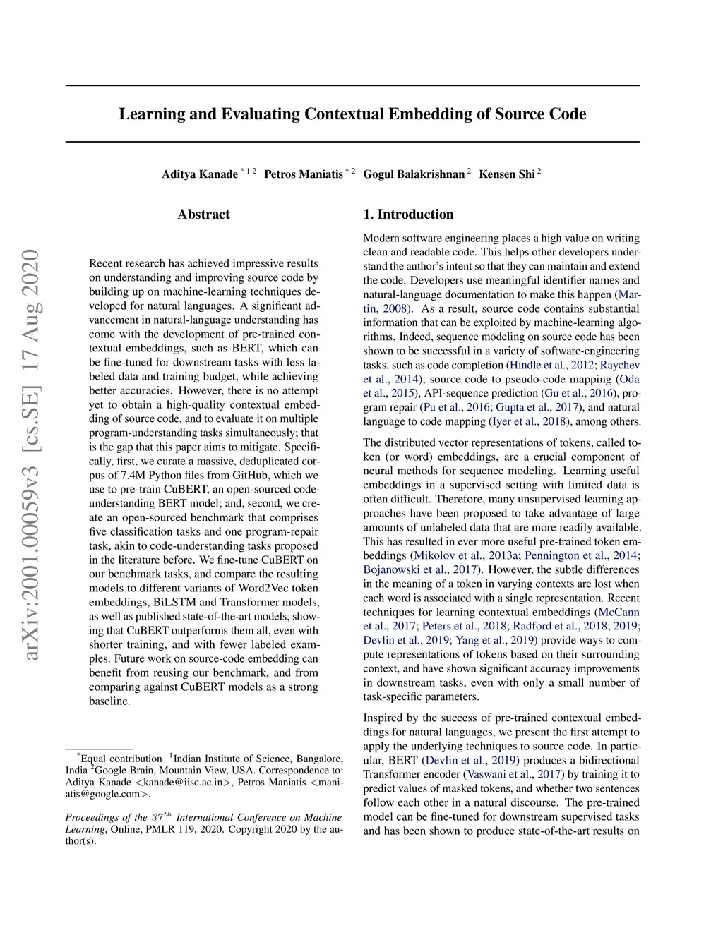 Recent research has achieved impressive results on understanding and improving source code by building up on machine-learning techniques developed for natural languages. A significant advancement in natural-language understanding has come with the development of pre-trained contextual embeddings, such as BERT, which can be fine-tuned for downstream tasks with less labeled data and training budget, while achieving better accuracies. However, there is no attempt yet to obtain a high-quality contextual embedding of source code, and to evaluate it on multiple program-understanding tasks simultaneously; that is the gap that this paper aims to mitigate. Specifically, first, we curate a massive, deduplicated corpus of 7.4M Python files from GitHub, which we use to pre-train CuBERT, an open-sourced code-understanding BERT model; and, second, we create an open-sourced benchmark that comprises five classification tasks and one program-repair task, akin to code-understanding tasks proposed in the literature before. We fine-tune CuBERT on our benchmark tasks, and compare the resulting models to different variants of Word2Vec token embeddings, BiLSTM and Transformer models, as well as published state-of-the-art models, showing that CuBERT outperforms them all, even with shorter training, and with fewer labeled examples. Future work on source-code embedding can benefit from reusing our benchmark, and from comparing against CuBERT models as a strong baseline.